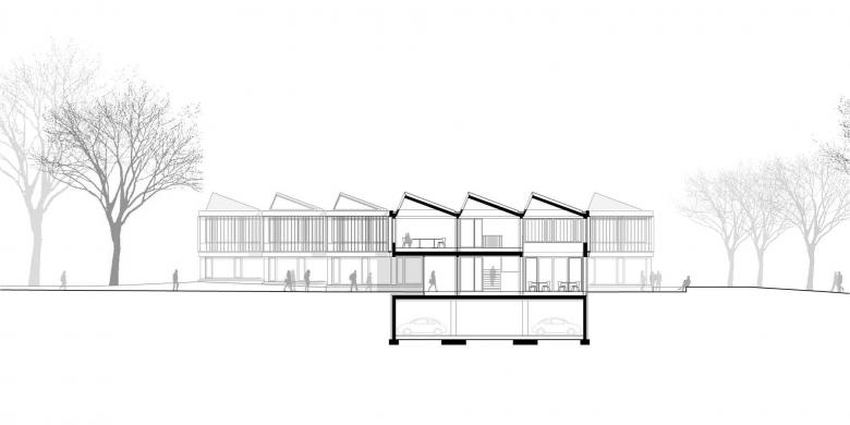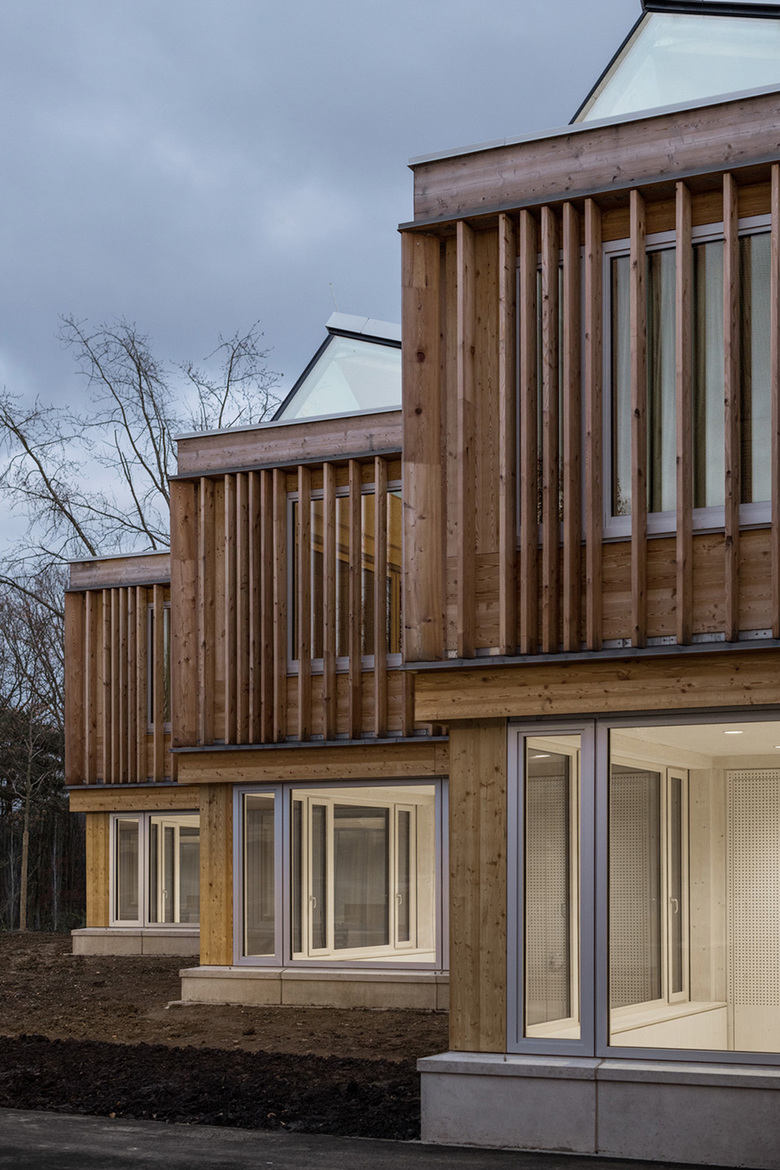 Der pavillonartige Neubau schmiegt sich in den Landschaftsraum des angrenzenden Kottenforst und fügt sich kleinteilig und maßstäblich in den gebauten, heterogenen Kontext ein.