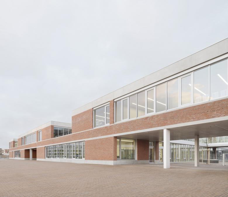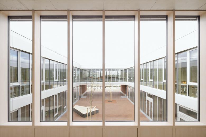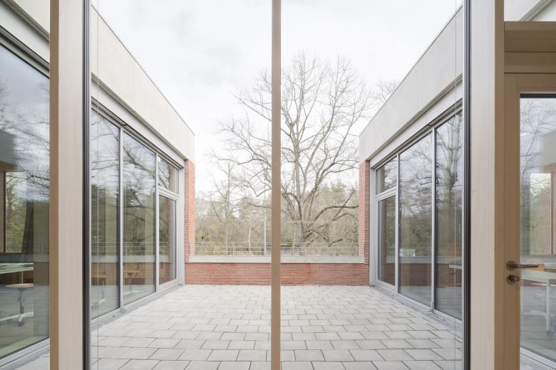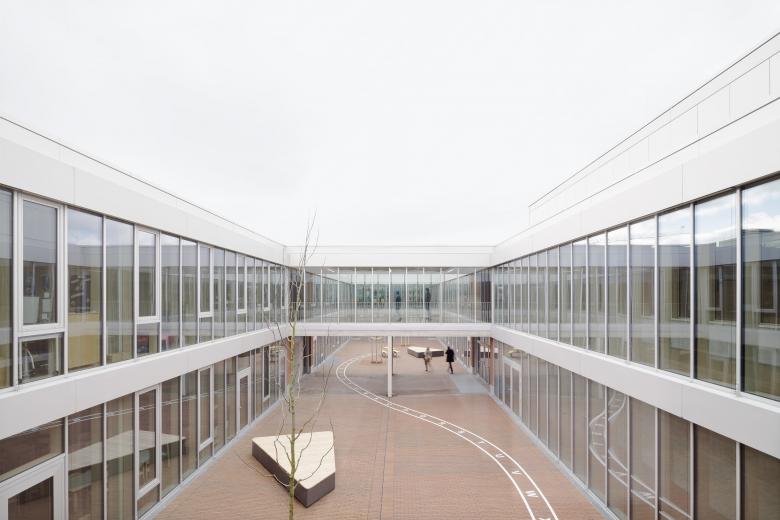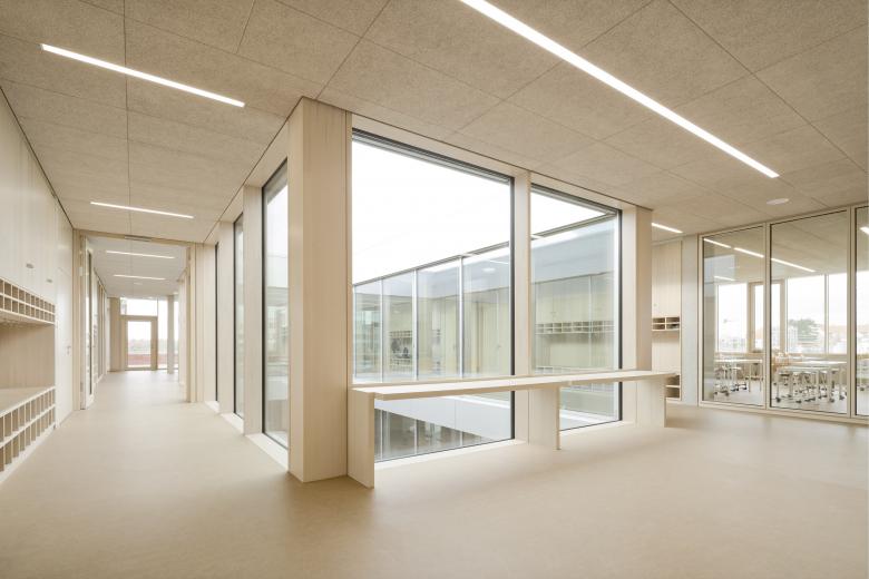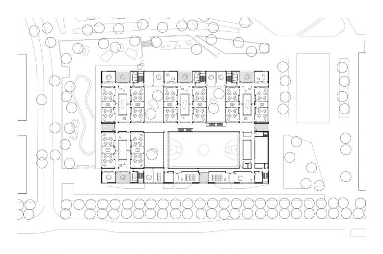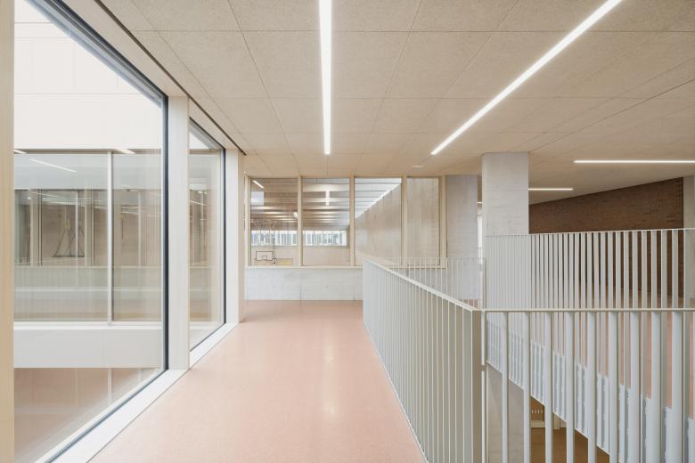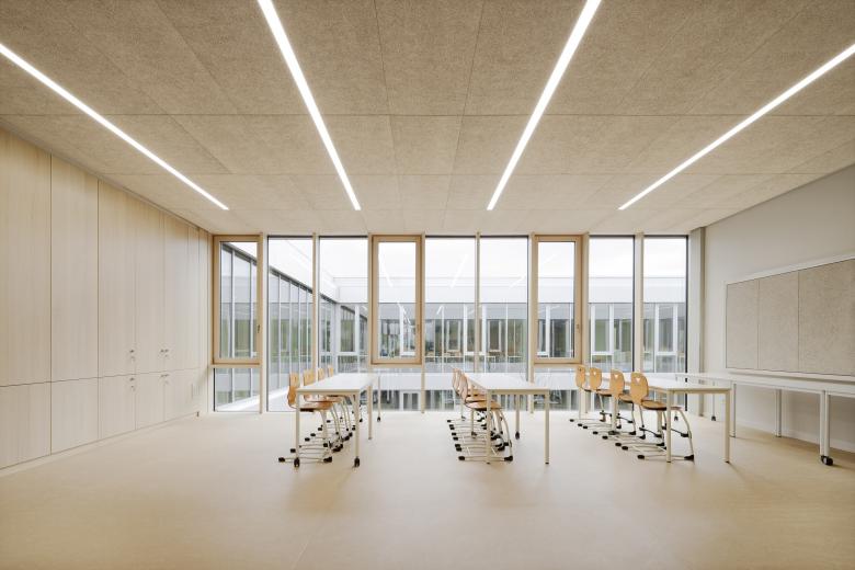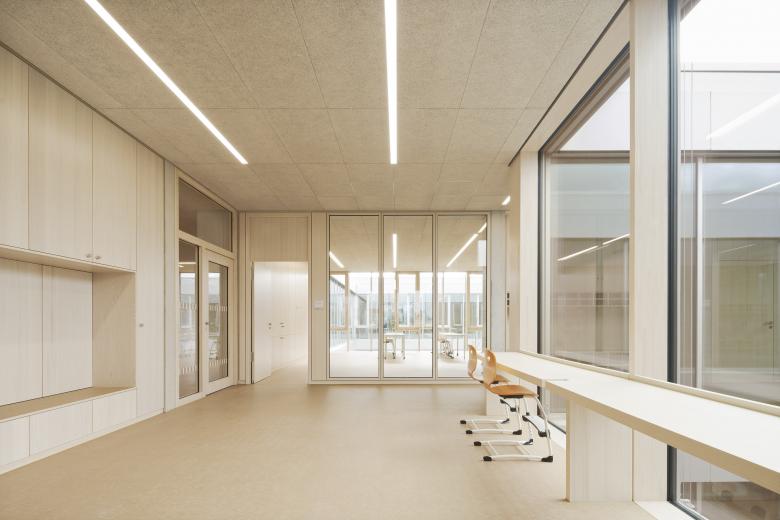 Schule und Kindertagesstätte sind zu einem Baukörper zusammengefügt, jedoch auch eigenständig ablesbar. Durch die ebenengleiche Anordnung aller Klassen wird der Austausch der Schüler zwischen den Jahrgangsstufen und so das Lernen von- und miteinander gefördert. Die Klassenräume öffnen sich zu den pädagogisch vielfältig nutzbaren, räumlich differenzierten Lernzonen. So entstehen unterschiedliche Bereiche, die selbstorganisierten, offenen wie auch abgeschlossenen Wissenserwerb, Lernen und Arbeiten alleine oder in der Gruppe ermöglicht. Die Gruppenräume der Kindertagesstätte sind L-förmig um zwei Lichthöfe angeordnet und zu den zugehörigen vorgelagerten Freiräumen orientiert.