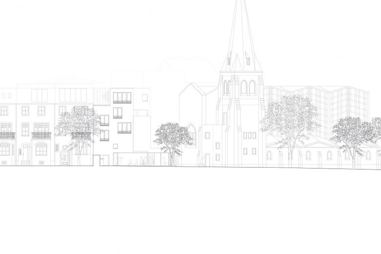 Das bestehende Gemeindehaus der evangelischen Petersgemeinde im Frankfurter Nordend ist abgängig. Der Neubau vermittelt zwischen der denkmalgeschützten Epiphaniaskirche im Süden und der nördlich angrenzenden Gründerzeitbebauung.