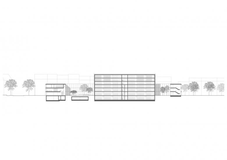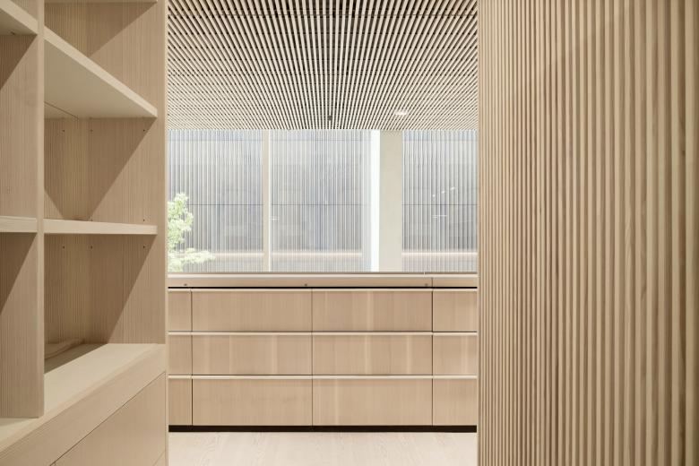 Eine dreigeschossige Mantelbebauung umfasst schützend die Archivalien – aus dem langgestreckten Schutzbau mit seiner ruhigen, zeitlos unaufgeregten Architektursprache, erhebt sich der fensterlose, auratische ‚Schrein‘ wie ein Schatzhaus.
