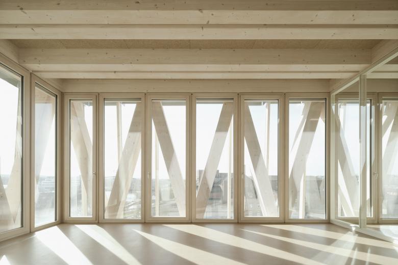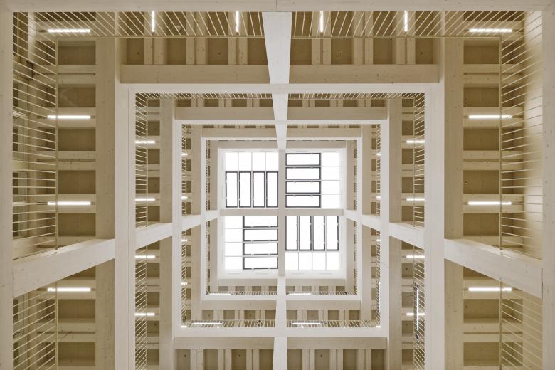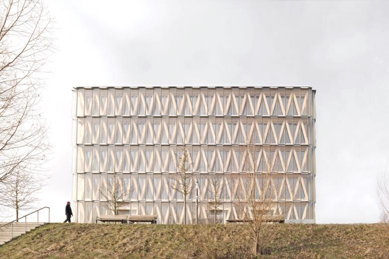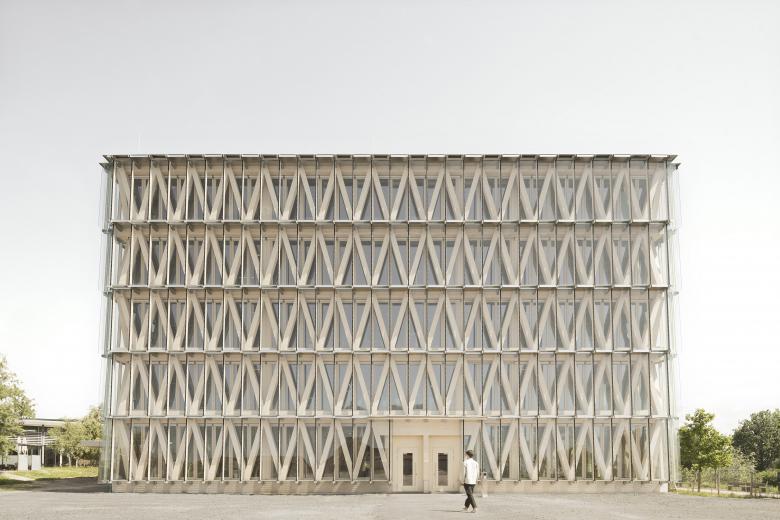 Die fachwerkartige Struktur der Fassadenstützen, die Logik der Konstruktion, bestimmt das ikonografische Erscheinungsbild.