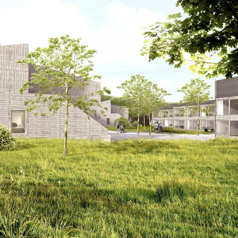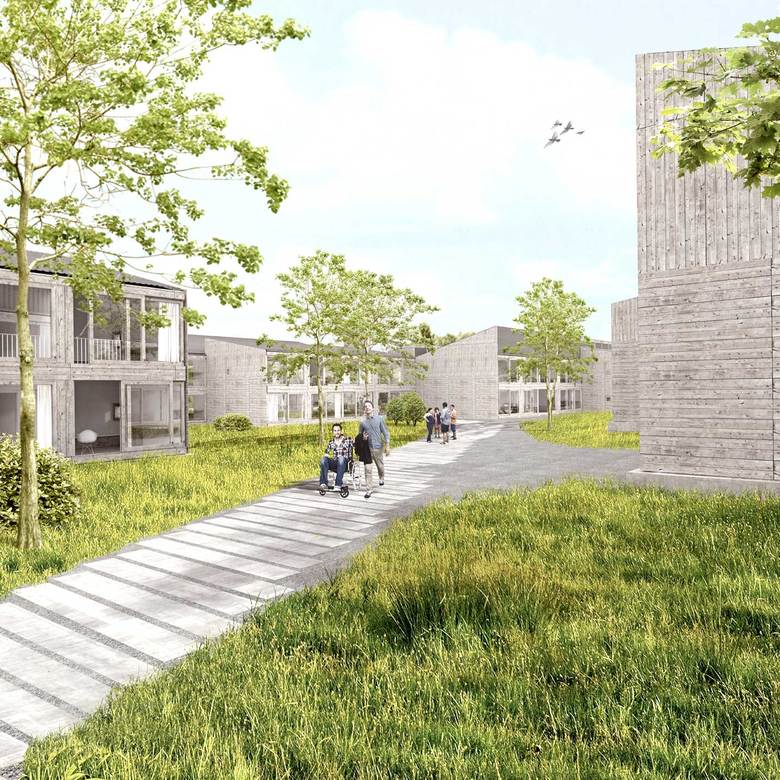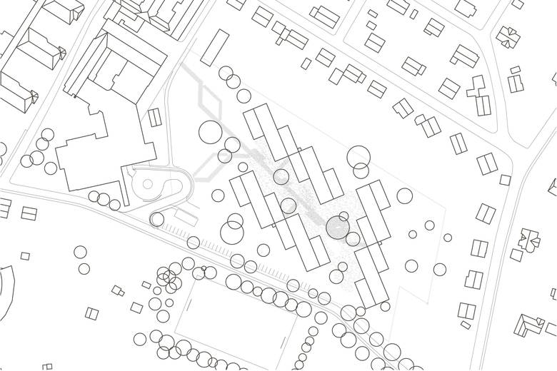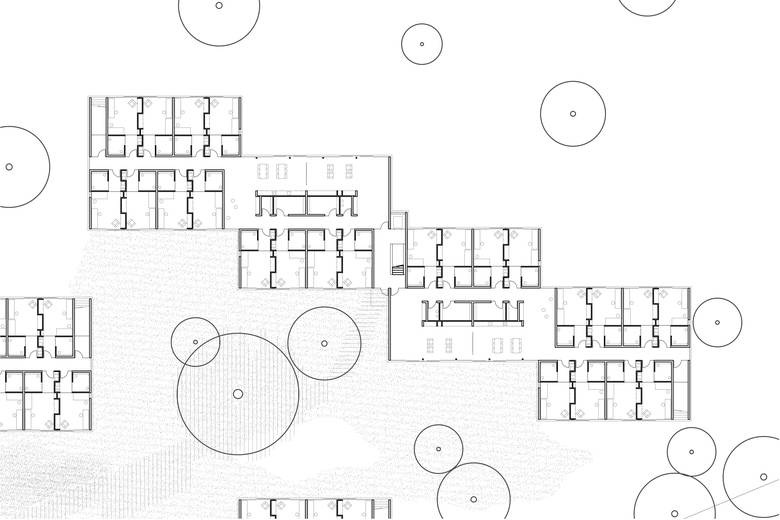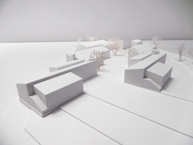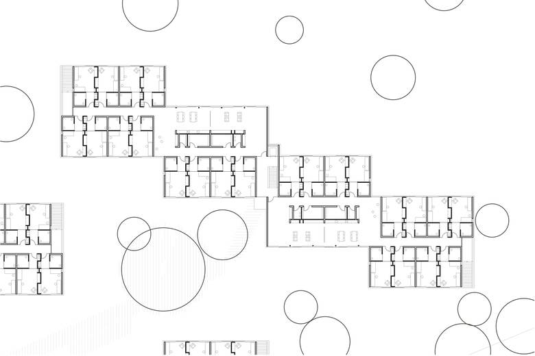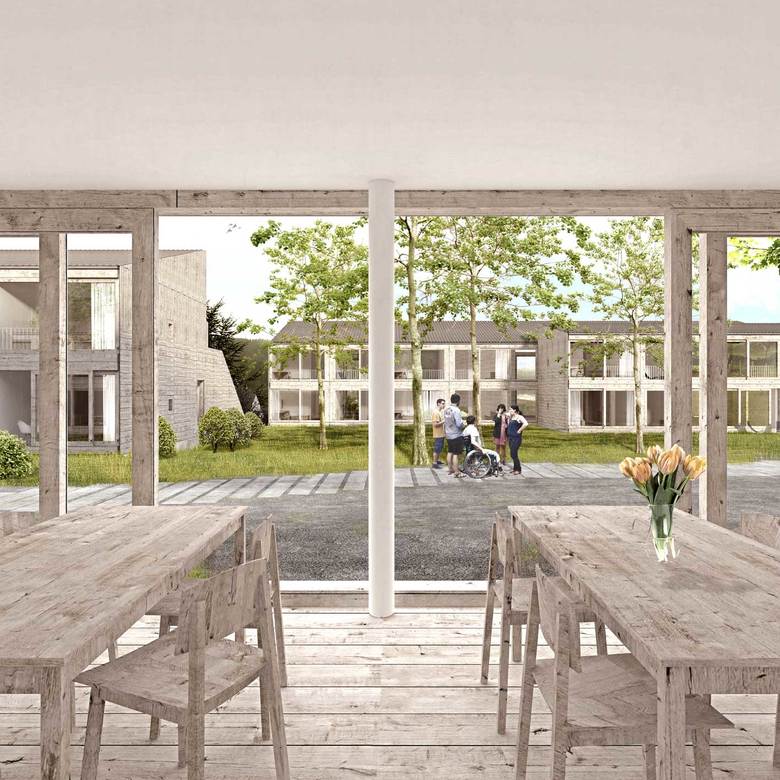 Jeweils vier zweigeschossige, entsprechend der Topographie gestaffelte Häuser mit wechselnden Dachneigungen werden zu einem Kettenhaus zusammengefügt. Aus insgesamt 12 klar ablesbaren Häusern entsteht ein kleinteiliges Ensemble mit spannungsvollen Zwischenräumen, die sich zu einem Platz aufweiten. Der Entwurf orientiert sich an der anschließenden Wohnbebauung und bewusst nicht am Großmaßstab der Gebäude der Behindertenhilfe. Enge und Weite sowie Ausblicke in die schöne Landschaft wechseln im Inneren und führen zu interessanten Innenräumen. Durch die raumhohen und bodentiefen Verglasungen sind alle Flächen auch in der Tiefe hell und lichtdurchflutet.