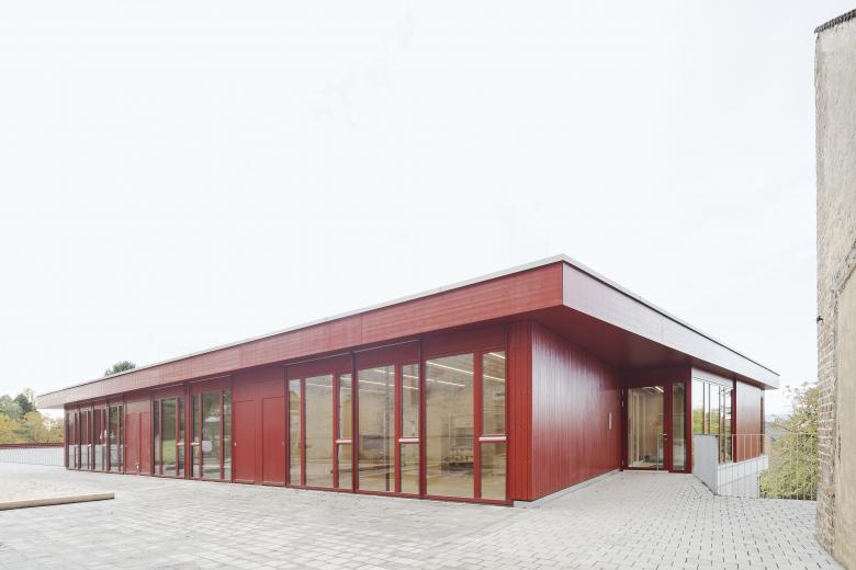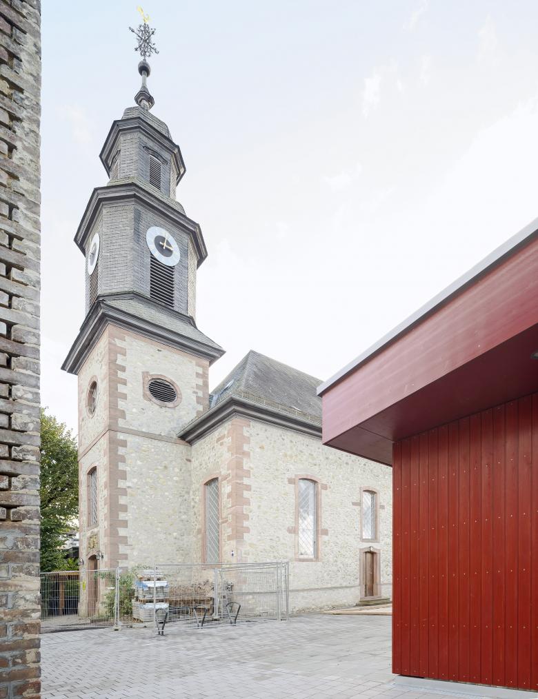 Der zweigeschossige Baukörper der Kindertagesstätte mit begrüntem Flachdach fügt sich durch die Hanglage des Grundstücks gefällig in die Nachbarschaft der Kirche ein.