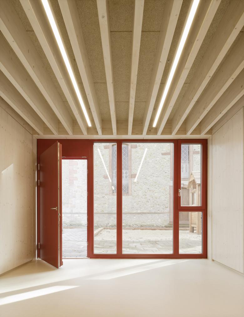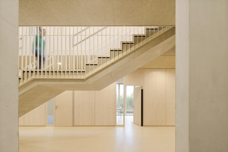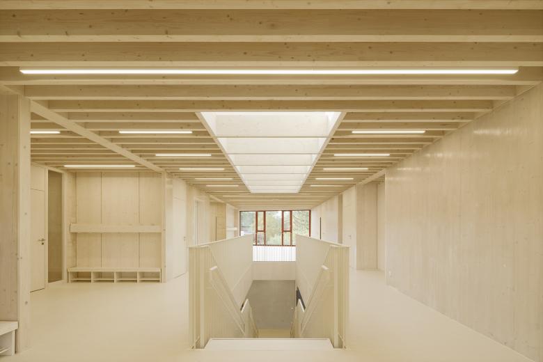Das massive Sockelgeschoss öffnet sich mit einer großzügigen Glasfront talwärts und bietet hier zwei Gruppenbereichen einen direkten Zugang in den Garten. Das Zentrum der Kita bildet eine einläufige Treppe in der innenliegenden Halle, die beide Geschosse miteinander verbindet. Ein Oberlicht über der Freitreppe sorgt für eine hohe Aufenthaltsqualität in der Halle, welche multifunktionale Flächen für Spielen und gemeinsames Essen bietet. Der erdgeschossige Holzrahmenbau ruht auf der massiven auskragenden Decke des Sockelgeschosses. Es öffnet sich ebenerdig zur Gartenseite Richtung Michaeliskirche mit zwei weiteren Gruppen- und Intensivräumen. Talseitig befinden sich die Verwaltungsräume, die Küche und der Mehrzweckraum.