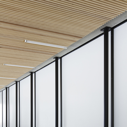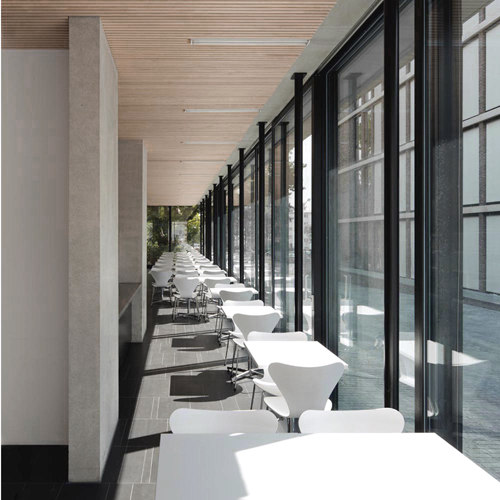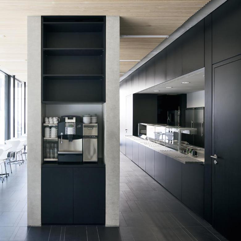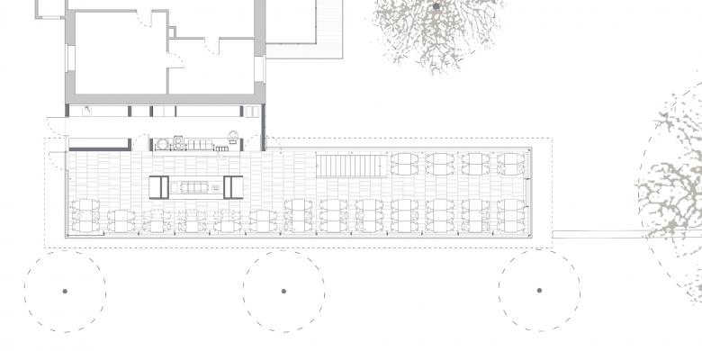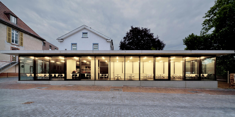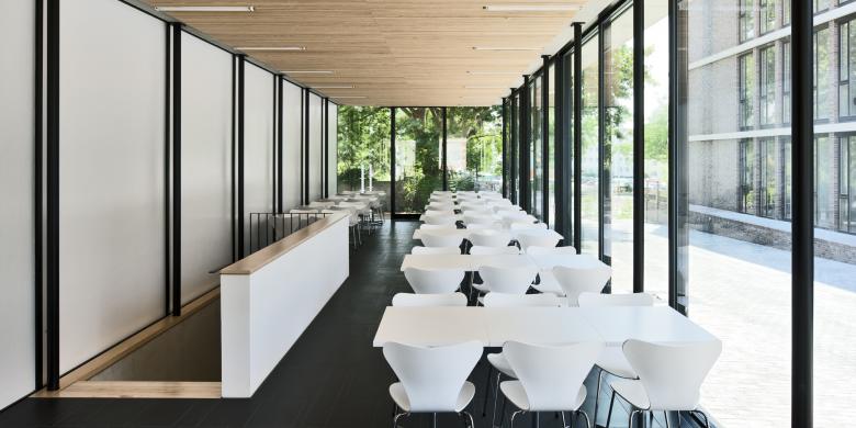 Der erdgeschossige, pavillonartige Baukörper orientiert sich einladend zur Stiftstraße mit einer durchlässigen Fassade, die sowohl den Blick nach draußen lenkt als auch den Blick von außen nach innen zulässt. Das schwebende Dach, getragen von filigranen Stahlrundstützen, unterstreicht elegant den großzügigen, luftigen Charakter. Die Materialkomposition aus hellem Holz, der dunkel kontrastierende Boden, das leichte Mobiliar und die transparente Fassade stehen in einem harmonischen Gleichgewicht, unterstreichen die lichtdurchflutete, einladende Atmosphäre und entsprechen so dem Wunsch von Begegnen und Geselligkeit.