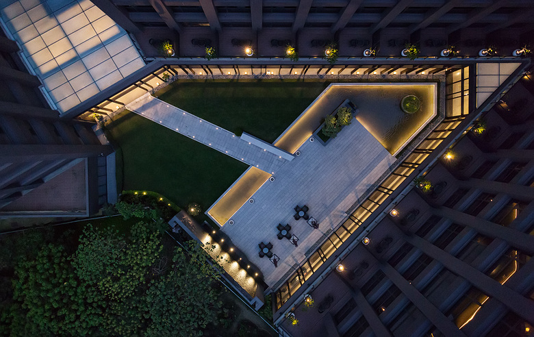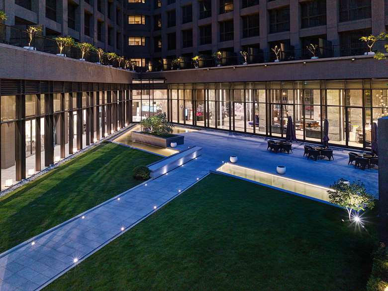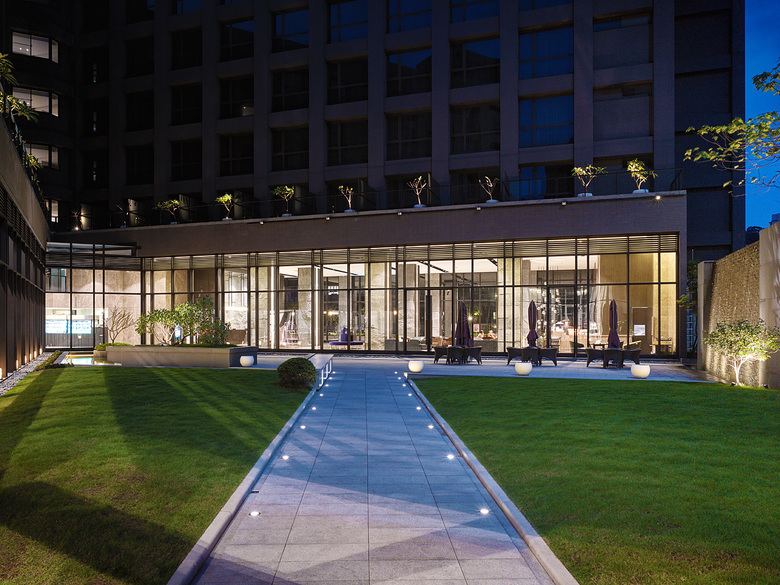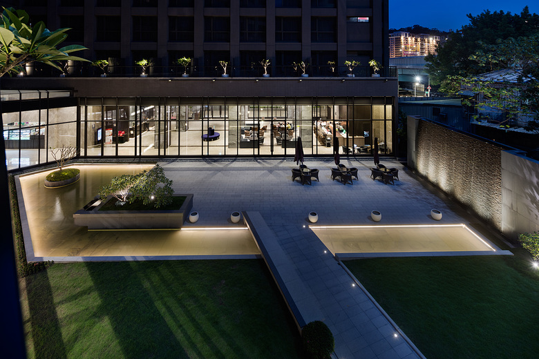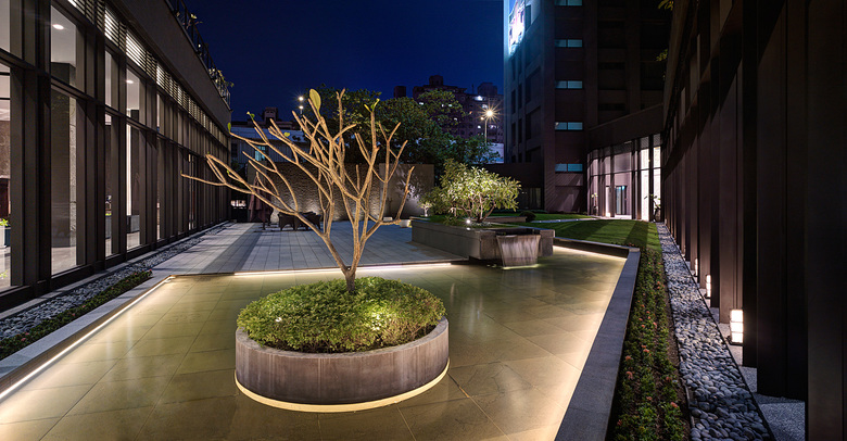 中庭靠近飯店大廳的平台,為活動的主要場地,尤其是婚禮證婚用途。因此「提供夜間足夠的活動照明,卻又不失整體概念」為本項目的挑戰。然而,因主體建築及其外牆已先完工,在不破壞原有建築的情況下,我們在二樓平台的屋簷下,安裝隱藏的下照泛光燈,模擬由大廳透出來的室內光,讓光線柔和地由內而外撒出,由高處俯瞰,有如漸層的色彩。如此,我們兼顧功能性的活動照明,並連結飯店整體與室外的美學。