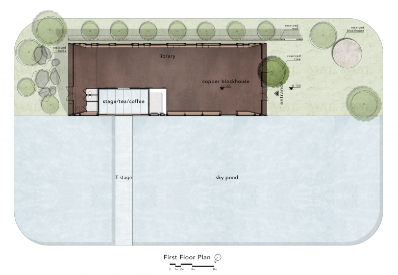 The rest of the park was designed by an excellent architect who gave the park a new look. However, I kept the newspaper wall on south side of the shed, the human security, the big tree, and the rockery. I tried to remain some fragments of the memory of the site because I am increasingly reluctant to forget. Each building in the park is abundantly designed, and that's why I preferred to keep the Copper Blockhouse simple. If the whole park is a partita, the Copper Blockhouse is a silent pause.