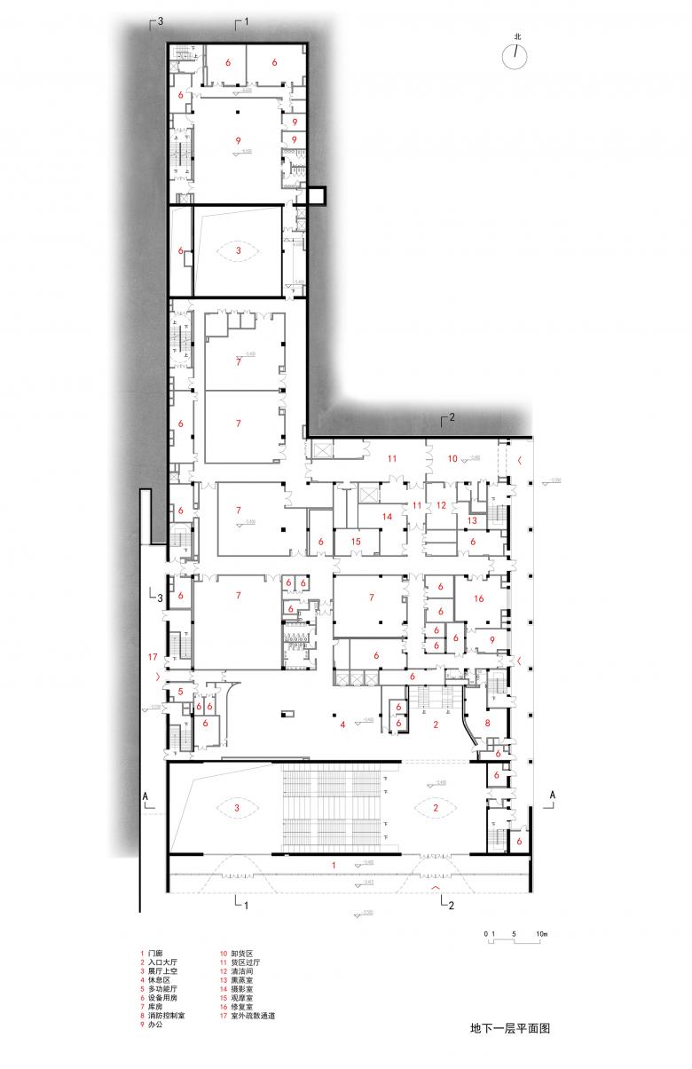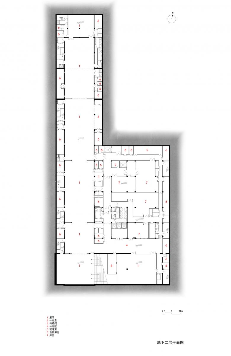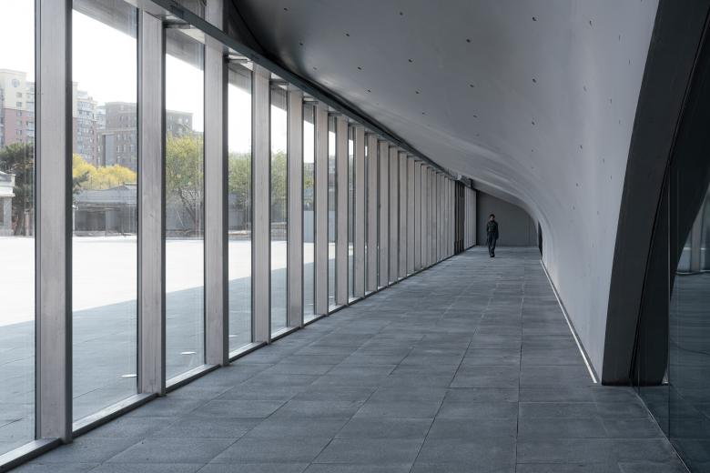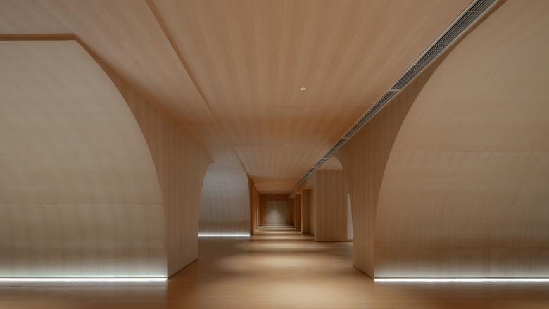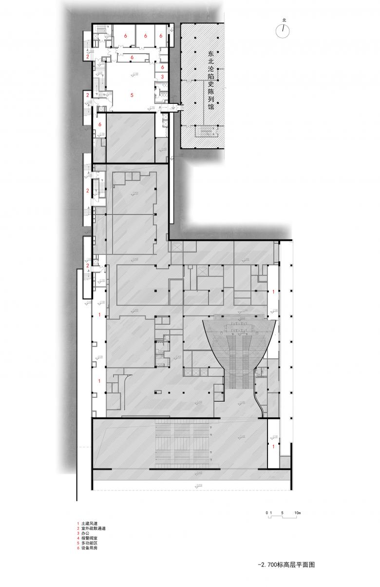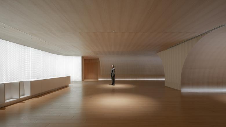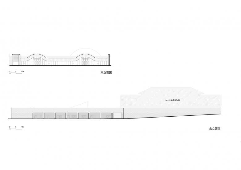 The continuous roof extends uninterrupted until it abruptly terminates at the southern plaza, where its cross-section forms the imposing facade. The vista in front of the exhibition hall's entrance remains unobstructed, while the southern plaza imparts a sense of the earth being delicately lifted. Nonetheless, visitors would never suspect the existence of a profound underland palace within the crevices of the earth, captivating their hearts and minds.