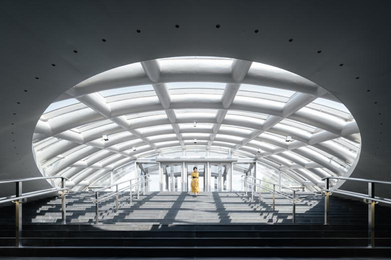 We designed a single-layer steel mesh shell with curved glass inserted into the ground in front of the main entrance of the exhibition hall. Going down the steps leads to the art museum's main hall, and turning around presents the exhibition hall framed by an elegant arch-shape.