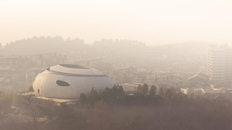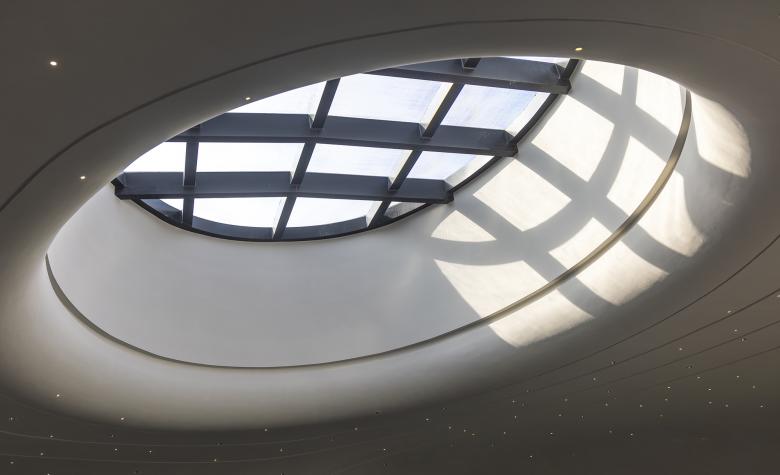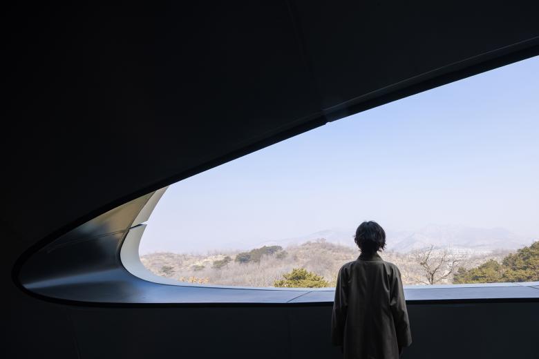 With this skylight, I wanted visitors to ascend to the summit. Drawing analogy from the Nazca Lines, I constructed a spiraling ramp that penetrates and emerges from the rock, evoking a gentle sense of flight. Zunhua and the Great Wall then unfold quietly before your eyes.