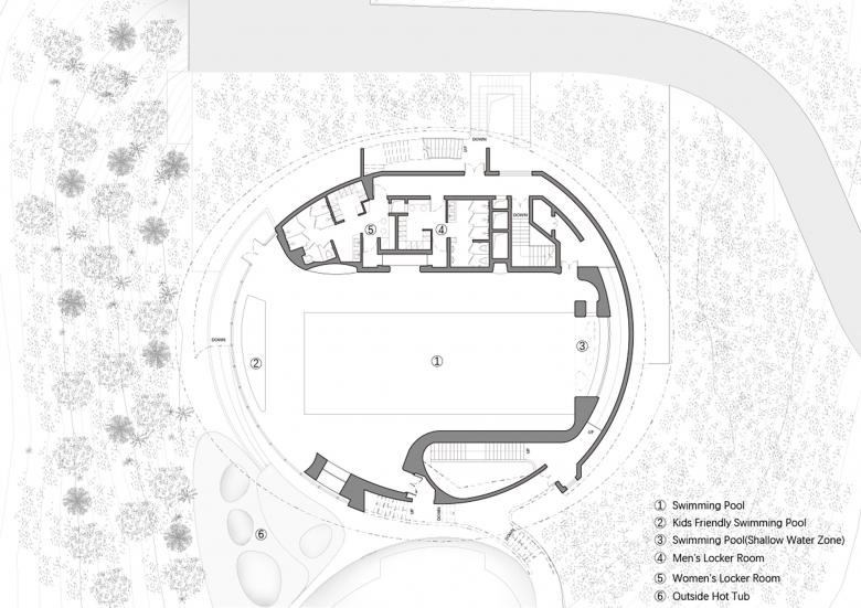 When snow blankets the mountaintop, all that’s visible are steaming pools and faintly spiraling curves. Nature becomes the true artist, transforming the center into a stone born of the mountain. The zigzagging landscape path connecting villas to the clubhouse is embedded in the earth—disappearing, reappearing, leading visitors into the experience from the very first step.