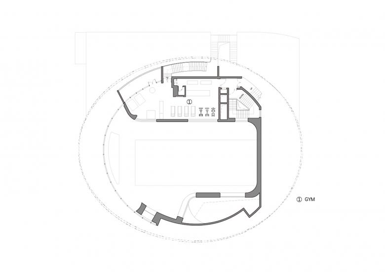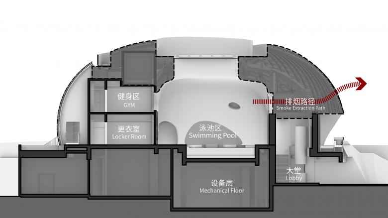 The pool hall rises 9 meters high and required 42 square meters of smoke exhaust openings. Besides the operable vents on the north curtain wall, others were hidden within the second-floor cave openings on the south side. Another challenge was coordinating MEP points within a radial utility belt. As the mechanical floor follows the elliptical pool, relationships between pool dehumidification, HVAC, and curtain wall structure had to be resolved detail by detail in BIM.