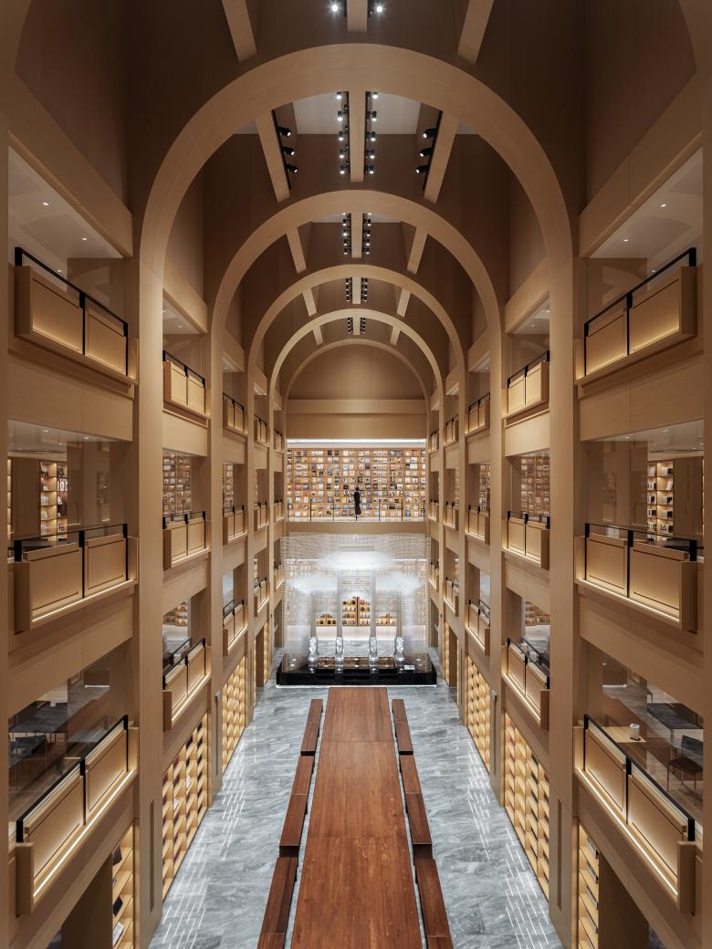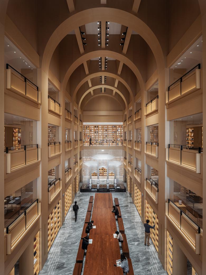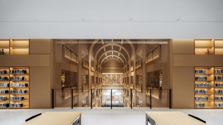 The B area, where the treasures are collected, exhibits a sacredness. In this regard, the architects borrowed the basilica, a typical spatial type of Catholic churches in the neighborhood of the library, to sanctify the atrium. The atrium ceiling is designed as an arch to complete the symbolic interpretation of the library as a temple of knowledge for people nowadays. The arch-form language is replicated on the first floor to form a continuous spatial expression, further divorcing the interior narrative structure from the facade construction logic to better fit the narrative of the Chinese set box. And because the Tou-Se-We Museum did not end up incorporating the library, we didn’t introduce the pagoda into the atrium. In the end, the decision was made to print a modern design rewritten pagoda in 3D printing as the culmination of the axis. In this way, the Western basilica and the Eastern pagoda, the traditional wooden structure and the modern printing technology as a pair cleverly completed the proposition, combining East and West and blending the ancient and the modern. Thus the symbolic meaning of Zikawei as the source of modern Chinese science is sublimated in the structure of the nested Chinese set of boxes in layers.