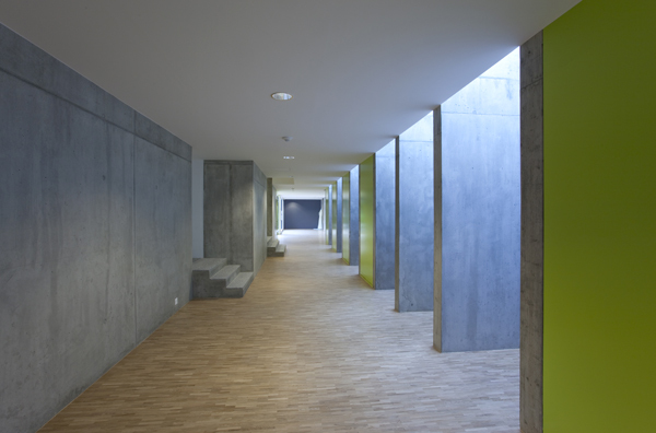 Des patios et éclairages zénithaux rythment l'accès de la lumière au niveau des bureaux et des circulations intérieures. Les façades sont revêtues de pierre et les ouvertures sont disposées de façon irrégulière pour accentuer la force du socle.
