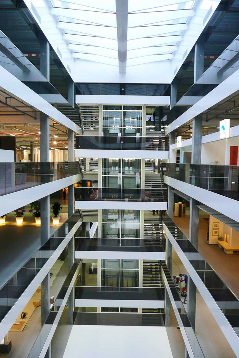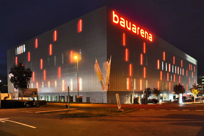 Die BAUARENA ist ein 6-geschossiger Bau und besteht aus einem Unter-, einem Erd-,4 Obergeschosse sowie ein Attikageschoss.
