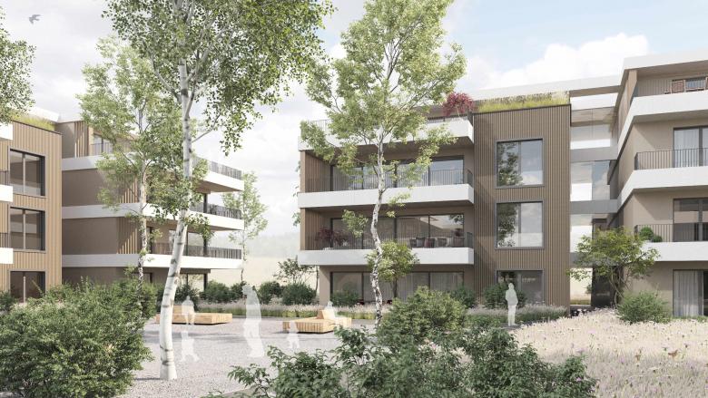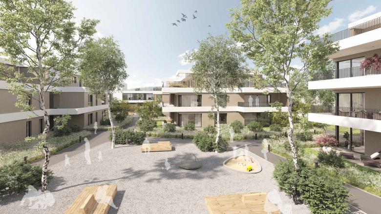 Die beiden grünen Freiräume sind die Hauptdarsteller und um sie dreht sich alles. Die Häuser orientieren sich in der Lage und Ausrichtung an ihnen und schaffen einen spannenden Dialog. In der ersten Etappe werden die Häuser 1 und 2 mit Eigentumswohnungen und das Haus 3 mit Alters- und Pflegebereich realisiert.