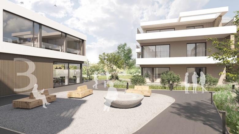 Wohnungen. Der Alters- und Pflegebereich beinhaltet zusätzlich 14 Zimmer und 3 externe Büros/Studios. Ein multifunktionaler Raum für ein Café oder einen Gemeinschaftsraum befindet sich im Erdgeschoss des Alters- und Pflegebereichs und orientiert sich zweiseitig zum Freiraum mit Brunnen und Garten.
