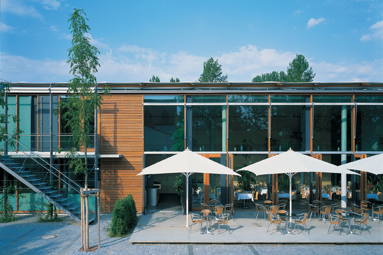 Der langgestreckte Baukörper steht vermittelnd im Spannungsfeld zwischen dem angrenzenden öffentlichen Grünzug und dem Vorplatz des evangelischen Gemeindezentrums, dessen Platzraum durch die Stellung des Bürgerhauses nach dem Vorbild bestehender Dorfstrukturen gegliedert wird. So hat das Gebäude zwei Gesichter: Zum Gemeindezentrum hin bildet eine zweigeschossige Fassade aus Glas und Lärchenholz die Platzkante; nach Osten hin findet die weiche Kontur eines Membrandaches ihr Pendant in einer Geländewelle, unter der sich die Tiefgarage verbirgt. Die Membrandachkonstruktion wurde in integrierter Planung entwickelt. Charakteristisch für die Konzeption eines dauerhaft als Versammlungsstätte genutzten Membranbaues ist die Sorgfalt, mit der bei der Strukturierung der Montageabläufe vorgegangen werden muss, da kritische Laststellungen vornehmlich während der Bauphase auftreten.