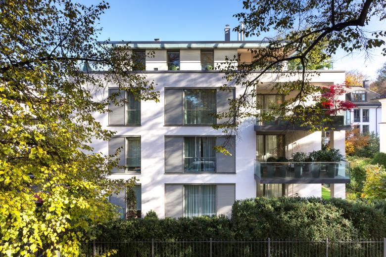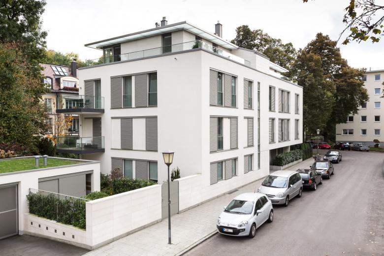 Der Neubau findet sich im Herzogpark im Münchner Stadtteil Bogenhausen. Die Lage ist durch sehr schönen, geschützten Baumbestand geprägt, der sowohl in der Planung als auch in der Bauphase einbezogen und genau berücksichtigt werden musste. Zwei kleinere Grundstücken, die zuvor mit Bungalows aus den 1950er Jahren bebaut waren, wurden vereinigt, so dass ein Areal mit gut 1000 qm zur Verfügung stand. Durch geschickte Auslegung des Abstandsflächenrechts konnte dem Wunsch des Bauherrn nach einer Maximierung der Wohnfläche entsprochen werden. Der moderne Gebäudekomplex besteht aus einem Wohngebäude mit drei Geschossen + Attikageschoss, sowie einem Untergeschoß mit Wellnessbereich und Tiefgarage. Die Süd- und Westfassade orientiert sich mit großen Balkon- und Terrassenflächen zur parkartigen Vegetation. Alle Wohnungen sind barrierefrei erschlossen, und sehr hochwertig ausgestattet.