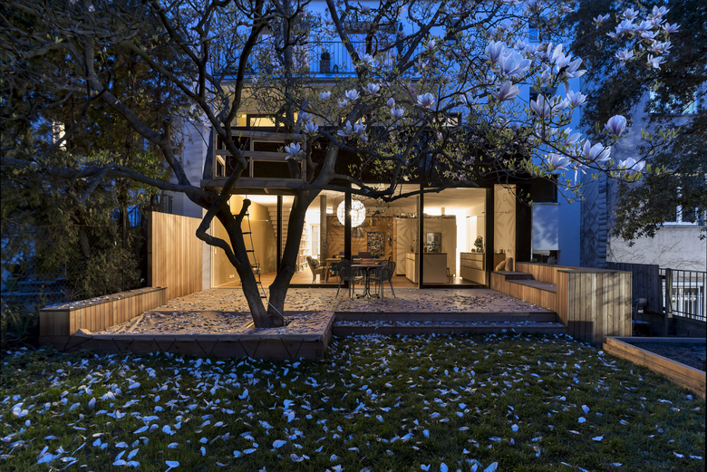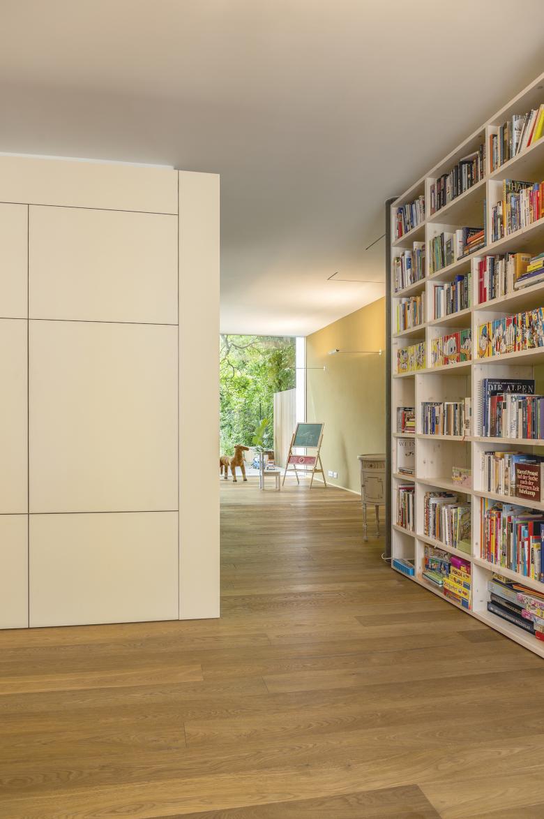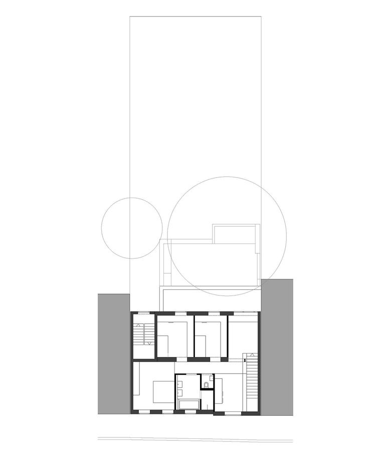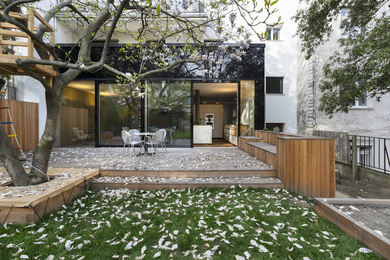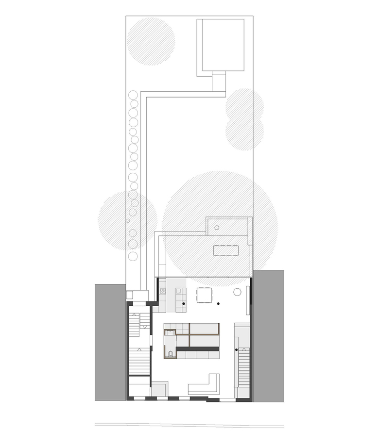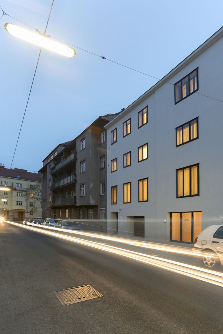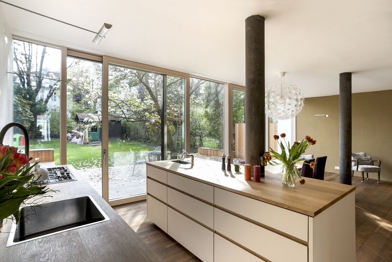 Die Garage wird zum Haupteingang. Eine Treppe zieht direkt in die nun offene Garten- und Wohnebene. Einen Stock darüber wird geschlafen und gearbeitet. Dank großzügigen Glasschiebeelementen gehen Garten und Küche unmittelbar ineinander über. Hier ist eine bestehende Magnolie ein Glücksfall. Das ehemalige Treppenhaus wurde belassen für zukünftige Szenarien. Jede Ebene ist daher leicht anders zu nutzen. Zurzeit ist die oberste Ebene vermietet. Wunsch der Bauherren war eine qualitätsvolle Architektur sowie möglichst ökologisch und nachhaltig zu bauen. Dämmmaterial aus mineralischen und organischen Stoffen, Solarpaneele am Dach, bauteilaktivierte Betondecken und ein Heizkachelofen bedeuten praktisch kein Heizen mit fossilen Energieträgern. Aus Lehm verputzte Wände, kein Silikon und keine unnötigen Verkabelungen sind im Haus normal. Neue Holz-Kastenfenster kombinieren gründerzeitliche Erscheinung nach Außen mit moderner Hochleistung nach Innen. In Summe stellt das Haus ein ökologisches Hightech-Produkt mit Niedrigstenergiestandard mitten in der Stadt dar.
