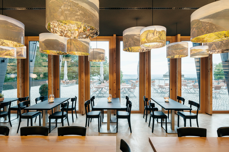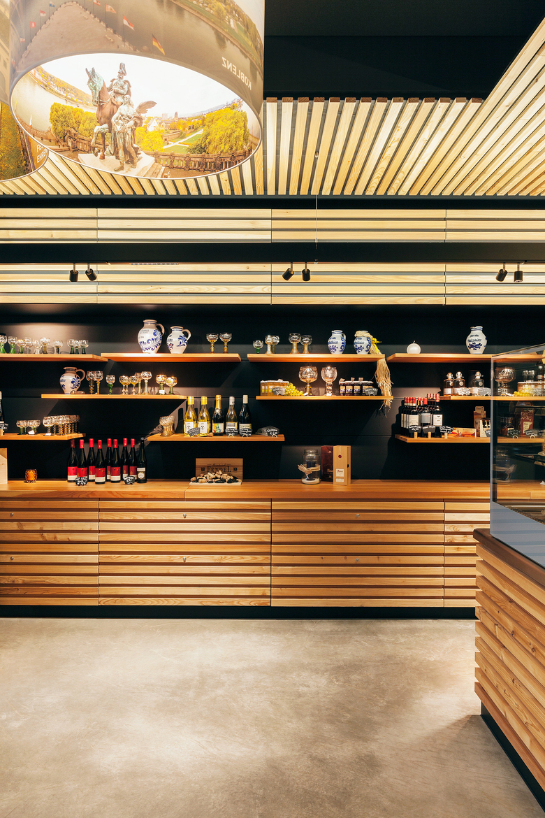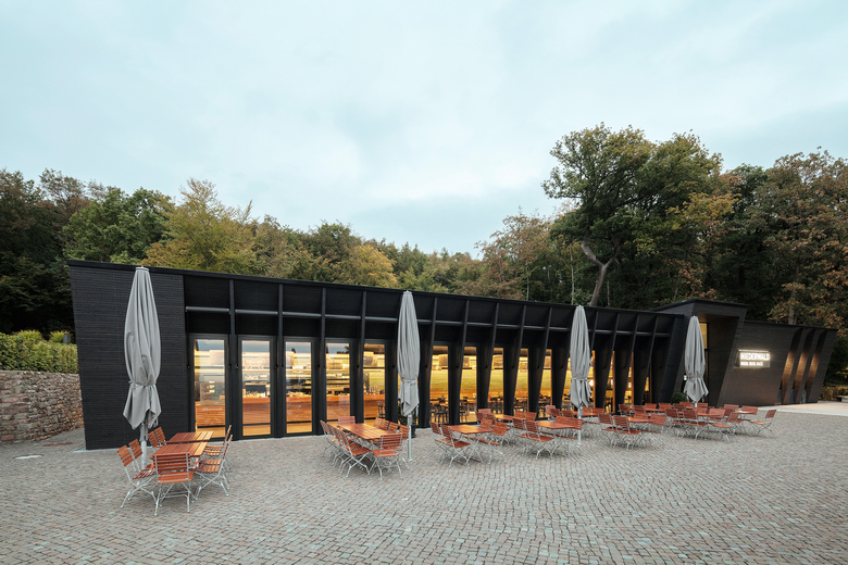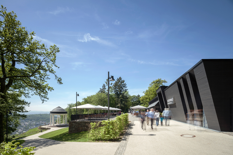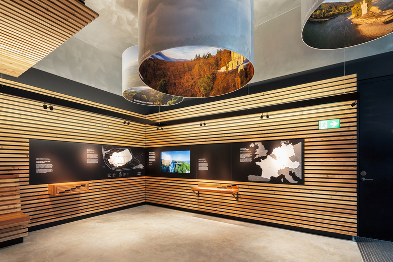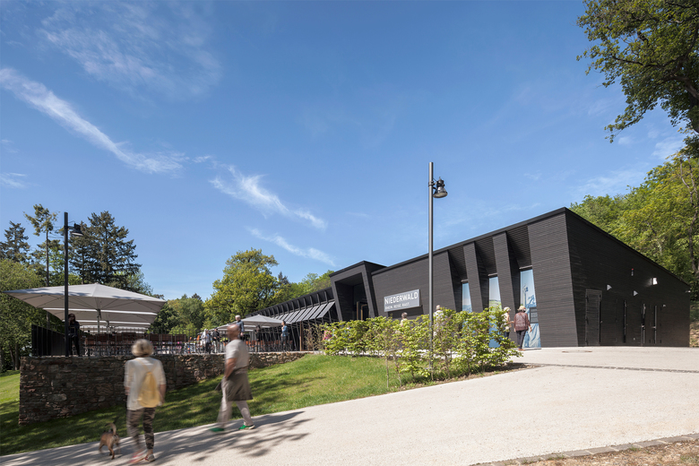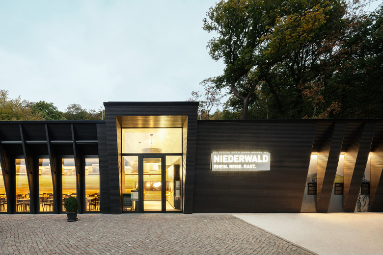 Das Besucherinformationszentrum liegt zwischen Seilbahnstation und Niederwalddenkmal am Eingang zum Ostein'schen Park oberhalb von Rüdesheim am Rhein. Das langgestreckte Haus liegt unterhalb der Zufahrt zum Parkplatz und fügt sich dank der dunkelgrauen Holzfassade mit den großen Fenstern in die Umgebung. Zur Terrasse wird die Fassade durch den Wechsel von raumhohen Fensterelementen und prägnanten Holzschotten gegliedert. Durch das Kippen der Fassade zur Talseite und dem zur Rückseite abfallenden Pultdach wirkt das Haus sehr dynamisch. Vor dem Haus liegt über die gesamte Breite die große Außenterrasse. Über diesen Platz verläuft der Weg der Besucher von der Seilbahnstation hin zum Niederwalddenkmal. Schon im Vorbeigehen können sie sich auf haushohen Informationstafeln über den Ort informieren. Den Zugang zum Haus wird von einem großen Rahmen definiert, der deutlich über die Kubatur ragt. Von hier gelangt man in den großen Multifunktionsraum mit Ausstellung und Restaurant. Der Gastraum wird von warmen Holztönen im Kontrast zu der dunklen Wandverkleidung und dem roh versiegelten Betonfußboden bestimmt. Eine Lampenlandschaft mit Motiven des Landschaftsparks sowie eine lange Theke sind die zentralen Elemente. Raumhohe Fenster ermöglichen den Blick über die Terrasse auf das Rheintal und weiter bis zum Odenwald zu. Im Bereich des Cafés können die Fenster vollständig geöffnet werden und ermöglichen so einen fließenden Übergang vom Gastraum auf die Terrasse. Im rückwärtigen Bereich sind Küche, Kühlräume, Umkleiden für die Mitarbeiter und die WC-Anlagen untergebracht. Bei der Planung des Hauses wurde viel Wert auf die Einbettung des Neubaus in seine Umgebung gelegt. Mit einfachen gestalterischen Mitteln wurde dabei eine Architektur entwickelt, die dem Ort einerseits und der Funktion des Hauses andererseits Rechnung trägt.