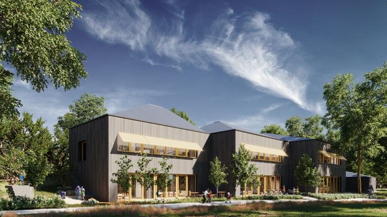 Der Entwurf sieht einen zweigeschossigen Baukörper vor, der sich in drei gleich breite Gebäudeteile mit jeweils einem eigenständigen Dach gliedert. Wegen der starken Topografie des Grundstücks wird der Baukörper in den Hang geschoben. Man betritt das Gebäude auf der Ostseite im Erdgeschoss über ein Foyer. Im EG orientieren sich die Krippengruppe mit Schlafraum, ein Mehrzweckraum und das Büro der Kitaleitung zum Garten. Hangseitig sind die dienenden Räume sowie Räume für Personal und die Küche mit Lager angelegt. Über das Treppenhaus mit Aufzug wird das Obergeschoss erschlossen. Hier orientieren sich die Elementargruppen und die Mischgruppe zur Westseite, während die Individualräume und der Personal- und Besprechungsbereich mit Teeküche auf der Ostseite des Gebäudes liegen. Die Gruppenräume im Obergeschoss orientieren sich mit großen Fenstern zum Garten. Der eingefriedete Spielgarten der Kindertagesstätte entsteht größtenteils auf dem benachbarten Grundstück und wird mit verschiedenen Spielpunkten für die unterschiedlichen Altersklassen ausgestattet. Die Spielbereiche für Ü3- und U3-Gruppen sind offen gestaltet.
