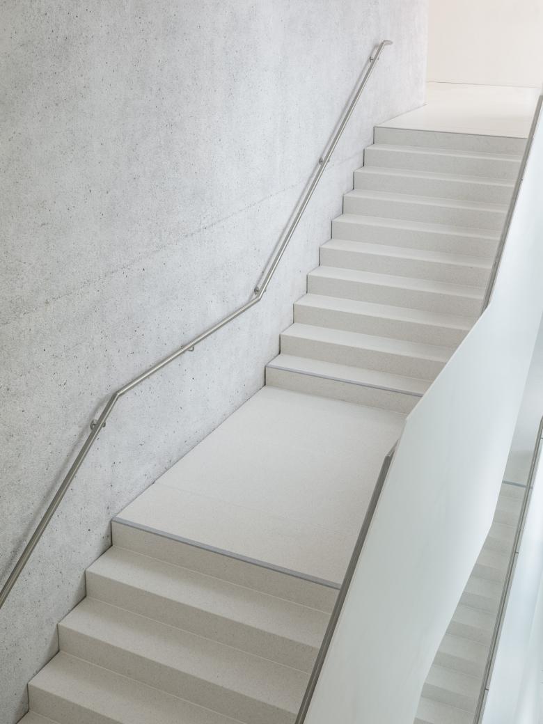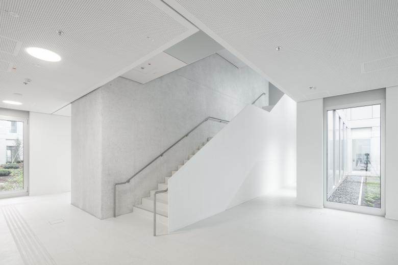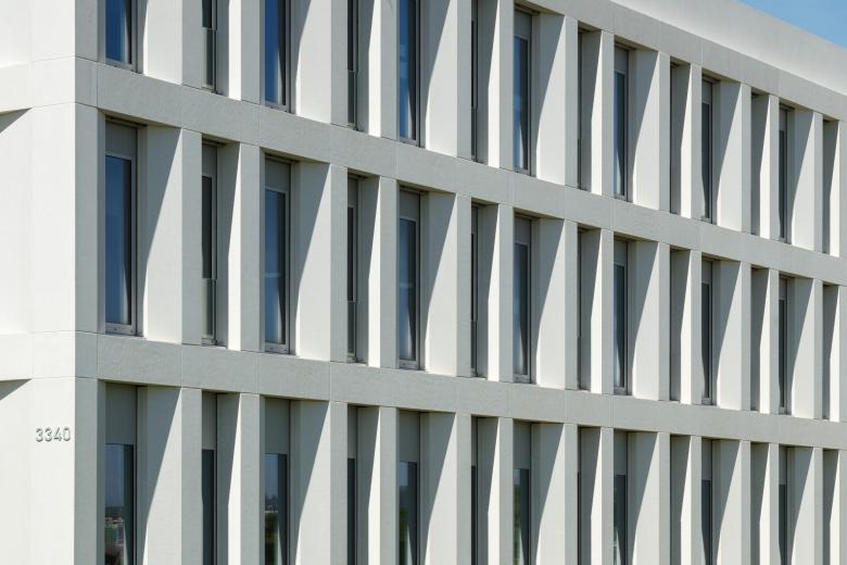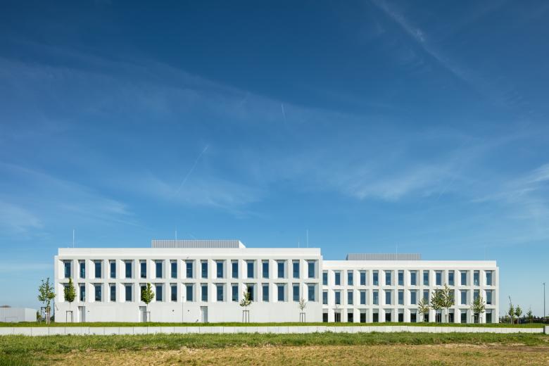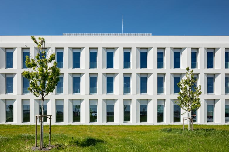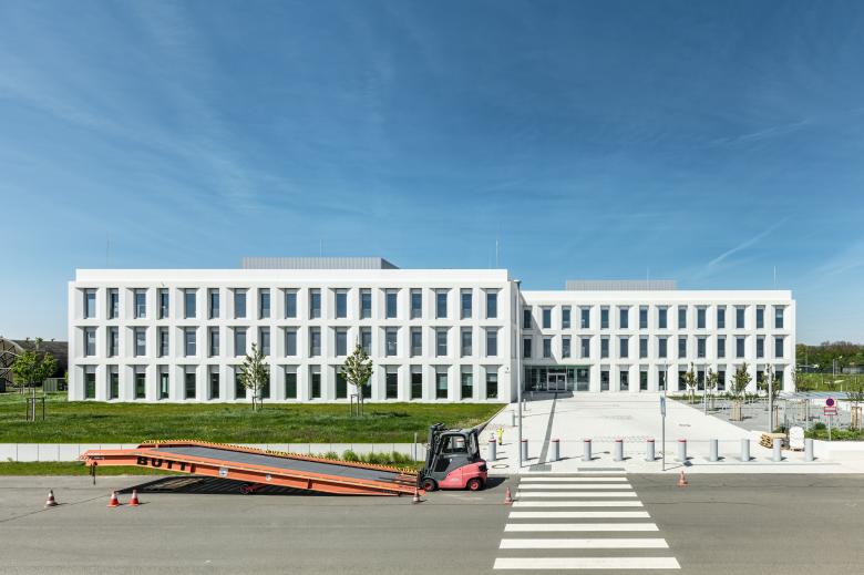Der Neubau des NAU Administrative Building liegt auf dem Gelände der Clay Kaserne bei Wiesbaden. Der durchgängig dreigeschossige Baukörper wird aus zwei versetzt angeordneten Volumen gleicher Größe gebildet. Der Versatz gliedert die Baumasse und lässt zur Straße eine Vorplatzsituation mit klarer Adressbildung entstehen. Eine Fassade aus vorgehängten, gestrahlten Betonfertigteilen verleiht dem Gebäude seine unverwechselbare Gestalt. In die Volumen eingeschnittene Patio-Höfe strukturieren die Baumasse und schaffen introvertierte und begrünte Außenflächen. Deren glatte und ruhige Aluminium-Fassade lenkt den Fokus auf die begrünten Außenbereiche. Die Innenräume und Einbauten folgen einem durchgängigen Farbkonzept in hellen, monochromen Tönen. Die Fahrstuhlkerne wurden aus in weißem gestockten Sichtbeton hergestellt.