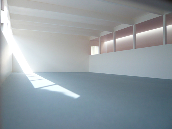 Im Innern wird die steinerne Gestalt des unterirdischen Volumens anhand von Sichtbetonwänden und Hartbetonböden spürbar. Die Turnhalle besitzt zwischen der sichtbaren Tragstruktur aus Sichtbeton ein Futter aus gestrichenen Sperrholzplatten, die auch eine raumakustische Funktion erfüllen.