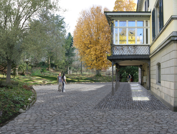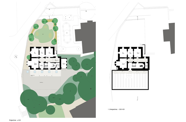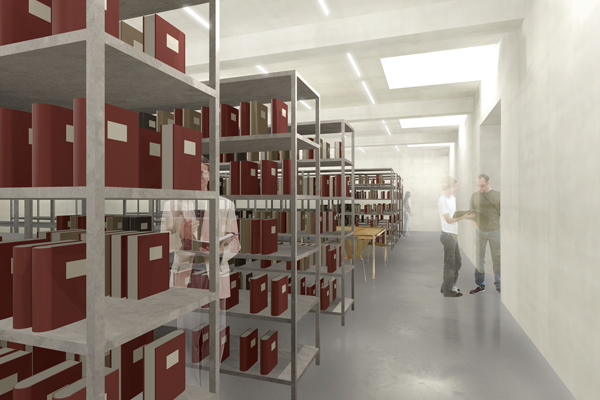 Der Zugang zum unterirdischen Anbau erfolgt über einen halbgeschossig versetzten Vorraum unterhalb des Haupteinganges. Der Bibliotheksraum ist stützenfrei konzipiert. Das zum bestehenden Gebäude versetzte unterirdische Bauvolumen spielt mit der im Altbau vorhanden Symmetrie und dem Brechen derselben. Als Tageslichtöffnungen sind fünf mit dem Terrainverlauf bündige Oberlichter entlang der Trennwand zum Altbau vorgesehen. Sie projizieren die Fassade auf die Ebene der Vorfahrt weiter in den darunterliegenden Bibliothekserweiterung und gestatten eine einfache Orientierung in dem grossen unterirdischen Raum.