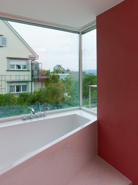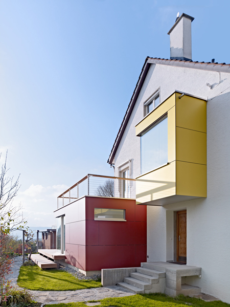 Die Wohnraumerweiterung schiebt sich als Neubauteil in das bestehende Gebäude. Die Stütze im Rauminnern markiert den alten Fassadenverlauf. Sie ist nicht nur statisch begründet, sondern verkleidet auch zahlreiche haustechnische Leitungen für die Obergeschosse. Zugleich unterteilt sie den über 60 m2 grossen Raum in einen Ess- und Wohnbereich.