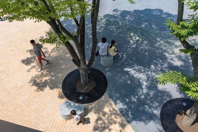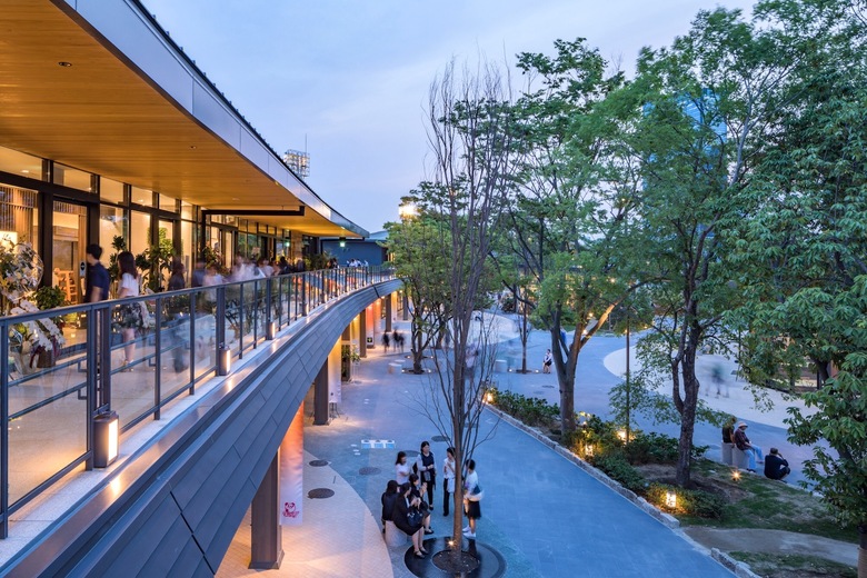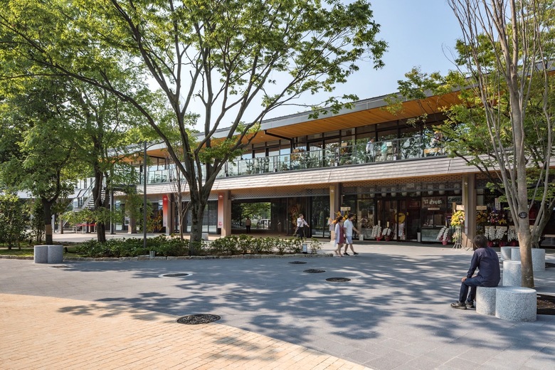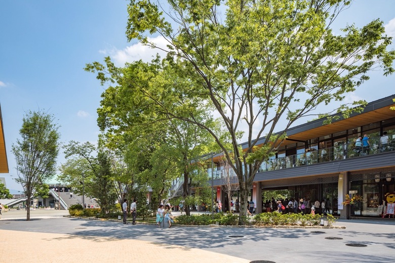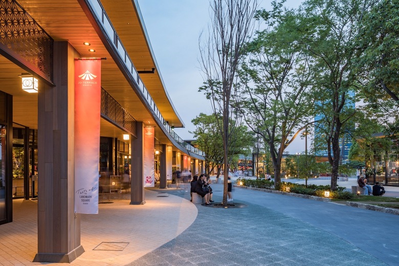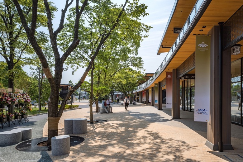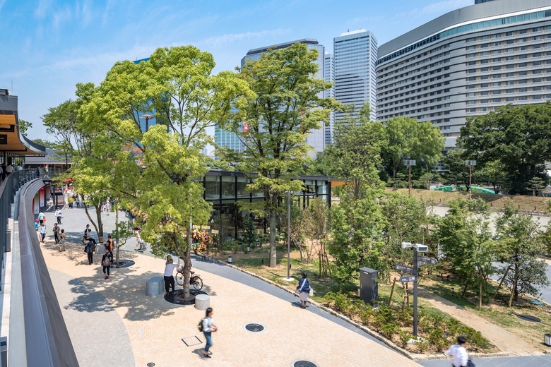 都会のオアシスであり歴史的場所である大阪城公園の入口に位置するジョーテラス大阪。オリジナルの大阪城は1600年代に建てられ、それ以来この城は大阪のシンボル的存在です。 私たちは既存の樹木をできる限り保存し、周りの森に馴染むよう努力しました。また、季節の樹木を織り交ぜ、海外、国内の来訪者を迎える庭としました。大阪の水都としての歴史を鑑み、床の模様は隣接した川をイメージしています。
