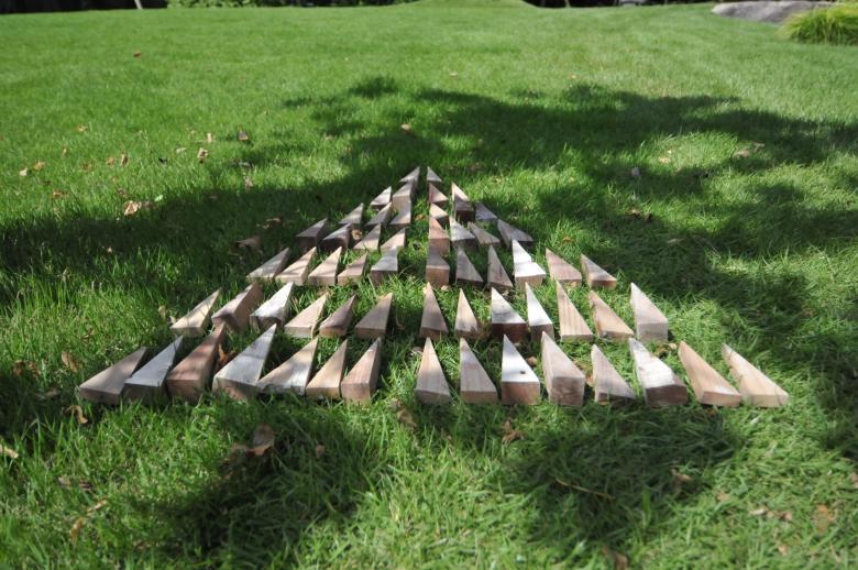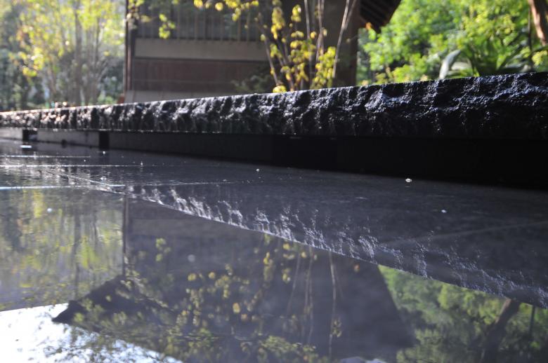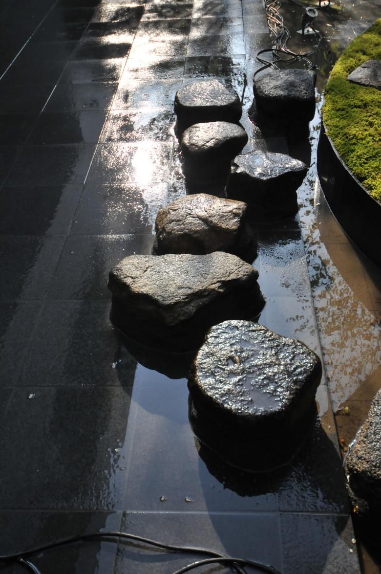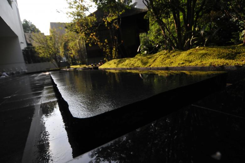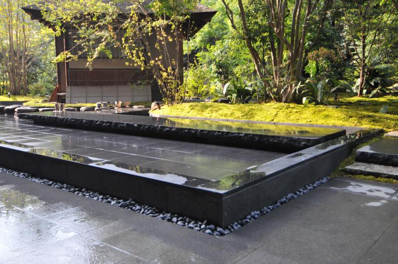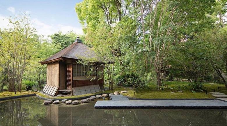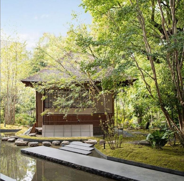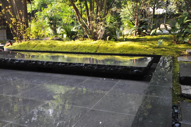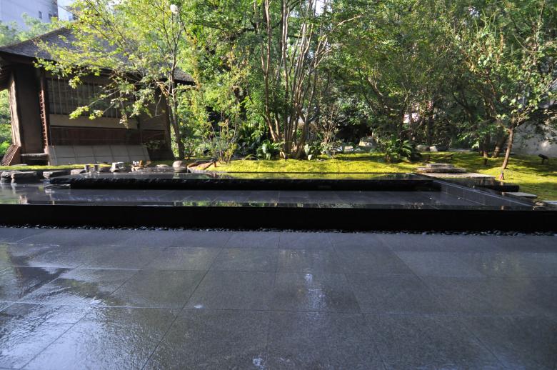 茶室が浮かび上がるように水盤を設け、そこに掛かる6メートルの橋石は太閤園を象徴する主庭の池の橋石をモチーフとし、水盤の周辺には紅葉や沙羅などの落葉樹を配した。