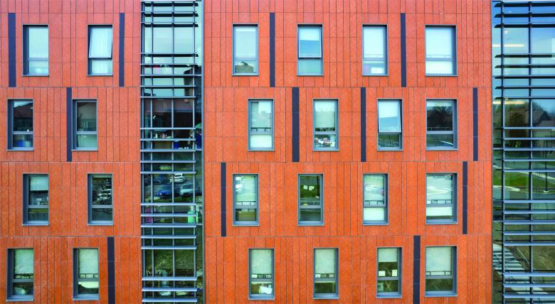 In einer Synthese aus Wohnzimmern, einem Speisesaal, kollaborativen Lern- und Lernräumen, die um Innenhöfe herum organisiert sind, bietet der neu entworfene Komplex von Ikon 5 Architekten heute diese außergewöhnliche Lernumgebung. Um den angrenzenden Campus einzubeziehen, auf die bestehenden Standortbedingungen zu reagieren und die Vielfalt eines interdisziplinären Austauschs zu fördern, haben sie die Wohnheime in ihrem Entwurf in 3 bis 5-stöckige Hofgebäude unterteilt. Im Mittelpunkt steht ein Speisesaal mit 1.000 Sitzplätzen, der eine Vielzahl von Mikrorestaurants fasst. Die Wohnlounges sind umhüllt von Keramikfassaden der Agrob Buchtal-Serie KeraTwin: im Design Naturkeramik unglasiert - in ihrer Farbigkeit von Lachs- bis Gold-Rot, strukturieren sie den Campus wie Leuchttürme. Umgeben von den Wohnblöcken, hebt sich die Mensa dagegen mit einer Tonalität in Grau und Schwarz ab. Ein hochtransparentes Erdgeschoss fördert die soziale Interaktion mit dem gesamten Ensamble.