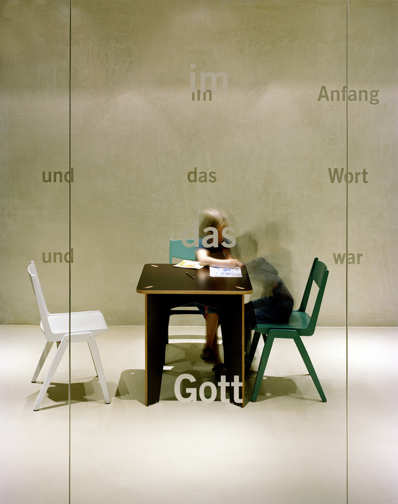 In dem Gefüge des denkmalgeschützten Kirchenschiffes wird ein Ort geschaffen, der sich subtil abgrenzt. Der Text „im Anfang war das Wort...“ wird als konkrete Poesie in den Raum gestellt und spannt zusammen mit seiner Projektion auf die Rückwand einen Ort im Zwischenraum auf.