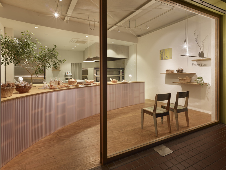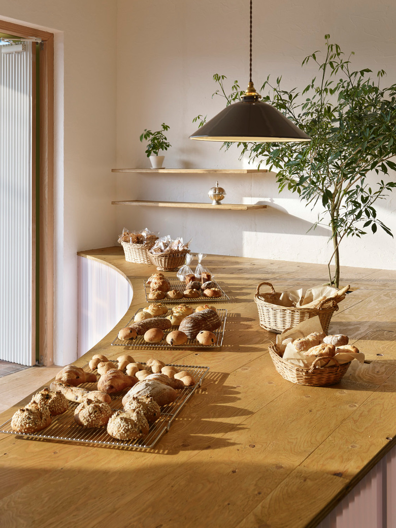 岐阜県岐阜市のパン屋さんのインテリア改装計画。ここでは厨房と売り場を等価と考え、それぞれの間に大きなテーブルのような台を挿入することとした。このテーブルは、パンを飾るディスプレイにもなれば、レジスペースにもなり、パンをスライスしたりこねたりする作業スペースになったり、店主は店の状況を常に把握しながら、パンの生産量に応じて様々な展開が可能となる。結果的にこのテーブルはパンの工房に伺うようなオープンな状態を生み、買い手とつくり手の間にコミュニケーションを生み出すものとなり、パンを焼いてから売るまでの過程をダイナミックに演出できる豊かな買い物空間となったのではないかと考える。