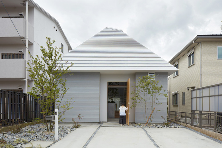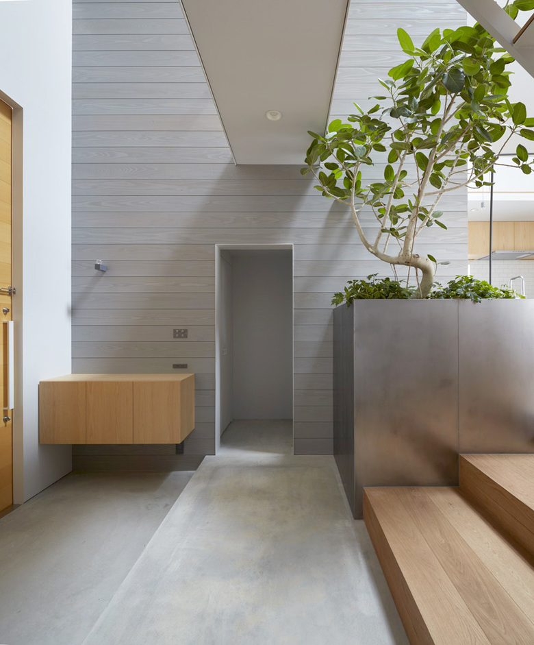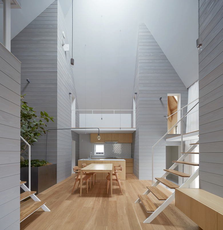 愛知県岩倉市での住宅の計画。敷地の3方向を建物に囲まれ北側の接道部分は公園に面する敷地であった。今回は大きな2つの要望をいただいた。ひとつは周囲にあまり開くような構成とせず閉じながらも解放的な空間がほしい。もうひとつは家族の気配を感じながら様々な居場所をもつ間取りとしたい。というものであった。ここではプライバシーを必要とする空間を挿入した2階建てのボリュームを柱のように4隅に配置し、その隙間を大きな吹き抜けを持つ共有部分のLDKとして、さらに頂点には大きな天窓を持つ空間構成とした。こうすることで高さによる開放性と上部からの自然光による明るさと光のうつろいを感じさせる空間を確保させた。全ての部屋が吹き抜けに接することで天窓の明るさによる恩恵を受け、様々な場所から吹き抜けを挟んで家族とのコミュニケーションを容易にすることを狙いとしている。また2階部分は全てブリッジでつなげている。これは生活導線をスムーズにするものでありながら、ロフト的な空間をちりばめて多くの居場所をつくると同時に、上下のコミュニケーションを生むものとしている。様々な場所を持ちながらも使い勝手を損なうことなく、家族と自然を感じながら快適な空間を実現した計画となった。