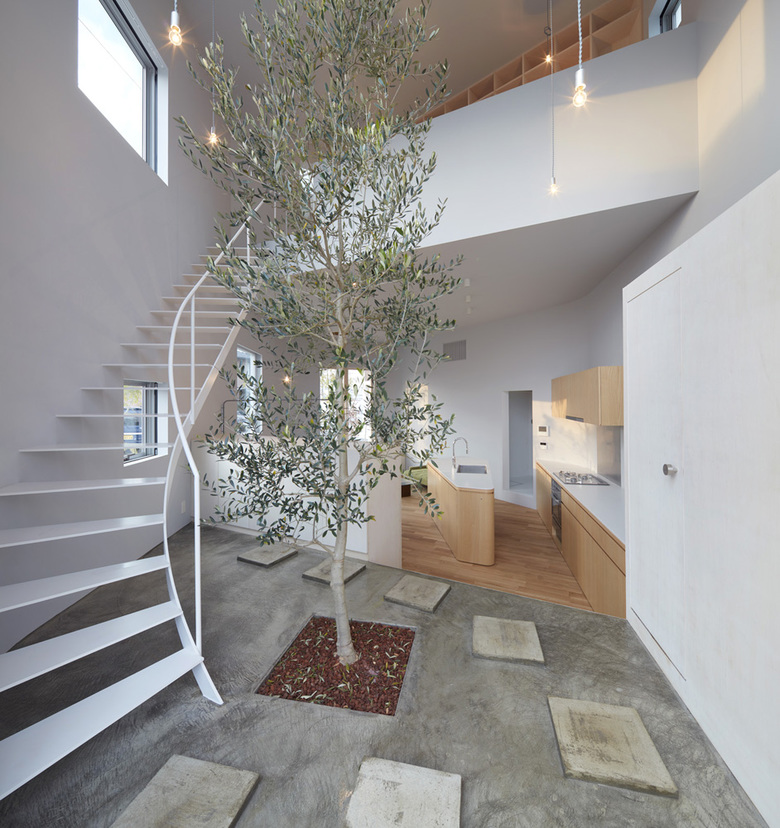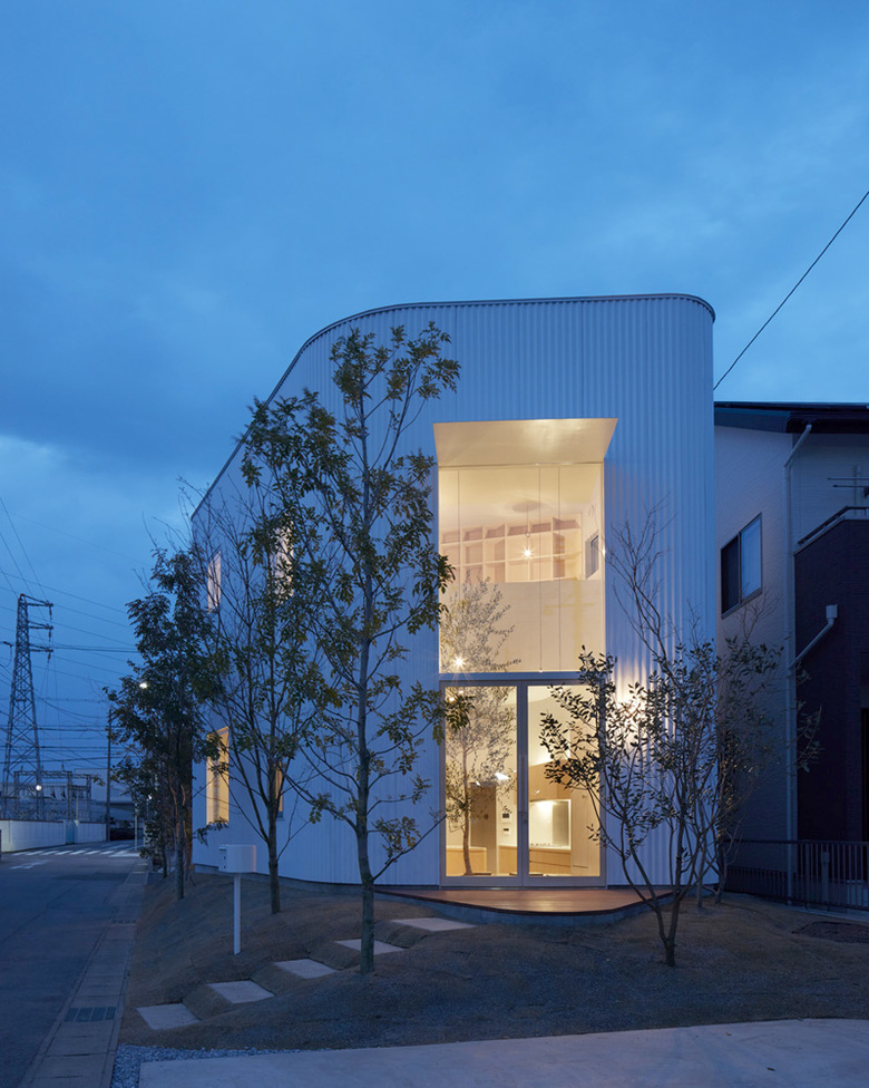 愛知県丹羽郡大口町で敷地の3方向が道路に面する細長い角地での計画。Webデザイナーのご主人の事務所としても使用しながら奥様と日常での距離感を保ち、天井の高い開放感なLDK空間を持った仕事場兼住まいを望まれた。敷地の東西が細いために、建物の幅を確保することが難しい。ここでは必要な分だけ斜めに平面をとり5角形の形状に。そして建物の角を丸くすることで角地に立つ建物の圧迫感を軽減するとともに、敷地に余白をつくることで多くの植栽をするスペースを確保した。そうすることで建物と道路の距離をとりながら、印象を柔らかなものとすると同時に、余白に設けた植栽が周辺環境に対して森のような役割となることを目指した。そして内部で採用した壁の曲線は、角という境界を無くし空間的な広がりを感じさせるものとして貢献している。結果的にその形状は、住宅と事務所の中間的な佇まいを持ちながら、内部空間の曲線をベースとした包まれるような質感と自然を感じられる開放的な空間を得る事を可能とし、住み手にとっても周辺環境にとっても豊かさを提供することを意図している。