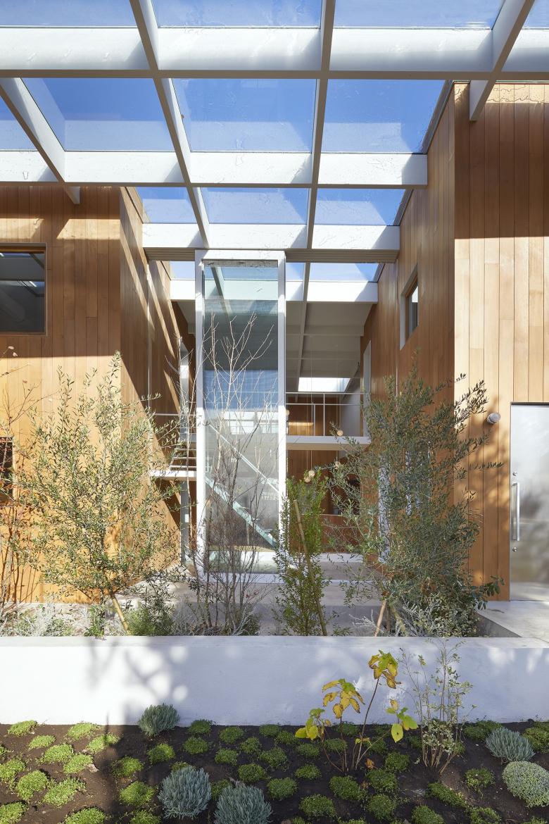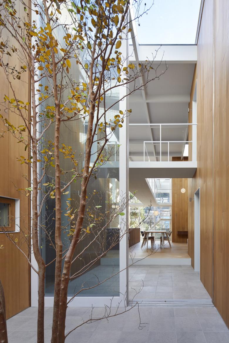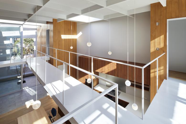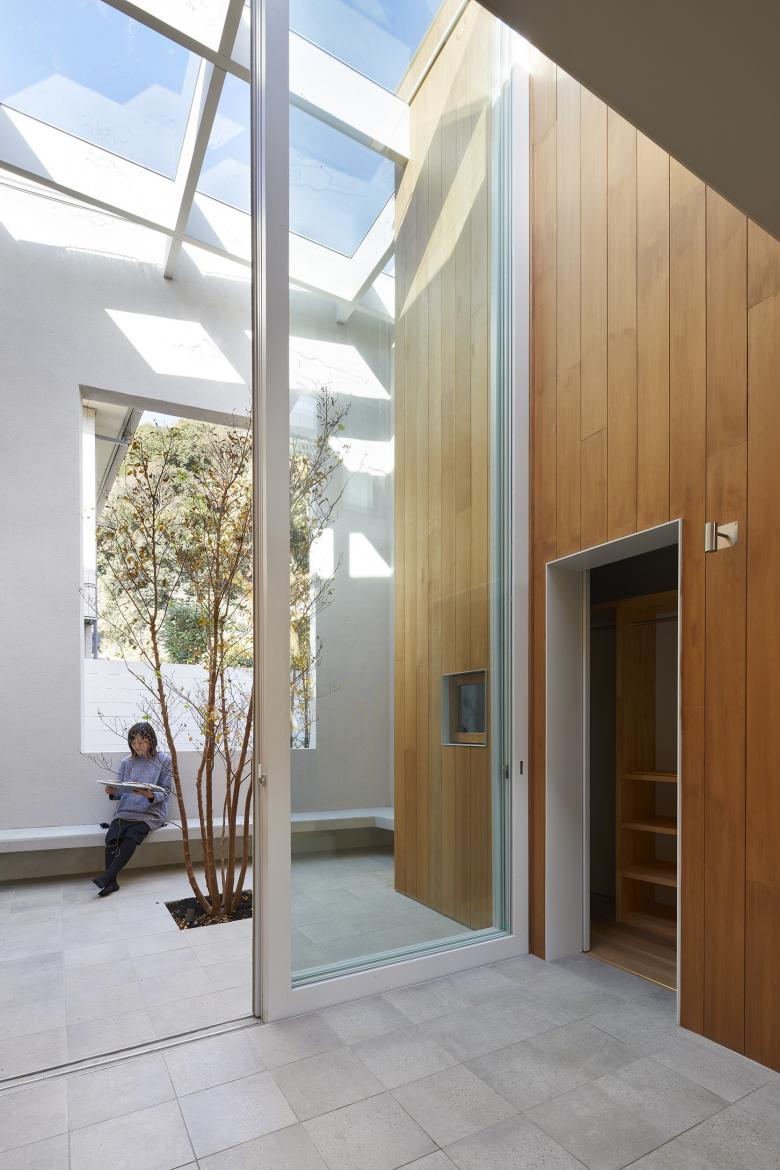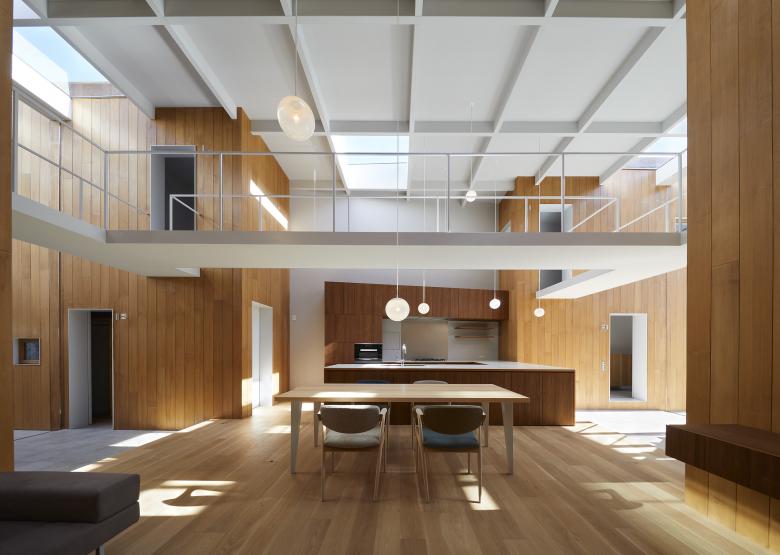 旗竿状で周囲を建物に囲まれている敷地での住宅の計画。施主からは自然を感じることができ広く開放的な空間を求められた。ここで考えたのは、まず2層分の吹抜けのワンルーム空間をつくり、外部→屋根のある外部→外部のような内部→完全な内部という順番で場所を配置して、中央のLDKに向かって外部から内部をグラデーション的に配置すること。そこから個室を点在させた板貼りのボリュームの中におさめて各々をブリッジでつなぎ、プライバシーを確保しつつもどこにいても家族と自然を感じられるようにした。そのブリッジはロフトのような廊下のような存在となり移動する楽しさを得られるものとしている。そして大きな特徴のひとつとして、南北に高さ5mの大きなスライドドアを配置した。全開すると、あたかも2層分の壁が無くなったように外とつながり、風が一気に部屋中を通り抜ける。この状況はもはや家全体が屋根のある外のような状態となり、開放的でありながらも閉じたような安心感を得ながら自然を感じられる豊かさを実現させるものとなっている。 部屋の配置と境界を区切る建具のありかたを考えて、家族との距離感と自然との向き合い方を考えた住宅である。