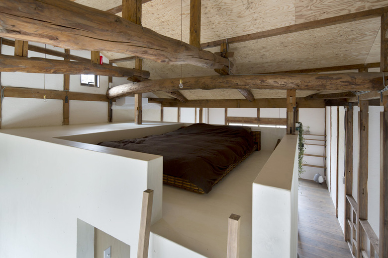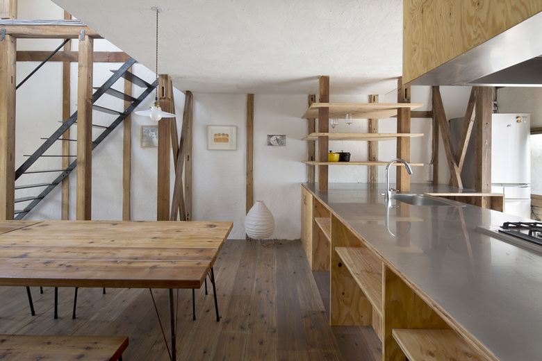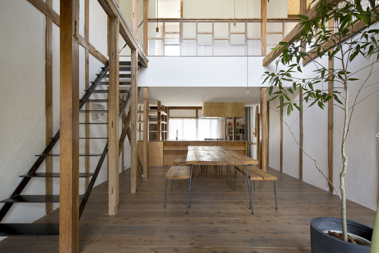 愛知県名古屋市千種区猫洞通で計画した「猫洞通のリノベーション」。2軒隣りあわせで建っていた築40年の町家を一つにつなげて住居兼店舗とした計画である。(店舗部分はMachiMachi。)毎週のように人が集まるため大きなダイニングキッチンを設けたいというご要望をいただいたため、玄関を入ってすぐの部分全てをダイニングキッチンとした。プライベートが必要な生活の場は2階に配置としたが、完全に上下階を分けずに天井を抜いて吹き抜けとし、ひとつの大きなワンルームのようなロフト的断面構成とした。また天井まであった間仕切壁も基本的には取り払い、東西の採光を両側から取り入れることで、和風の住宅でありながら明るい内部空間を得ることを目指した。骨組みの状態まで戻すことで空間的広がりを最大限確保すると同時に、構造計算をして補強を行い強度を高めそれをデザインとして昇華させた。このような古い建物のストックが多くなっていくであろう時代のなかで、生かすこと、減らすこと、補強すること、を工夫することで豊かな空間を手に入れた一例になったのではないかと考える。店舗部分は MachiMachi