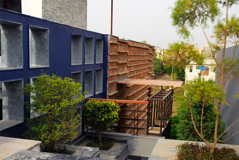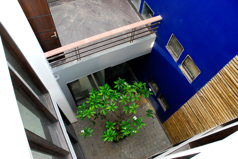 The stairwell is designed to be a shared community vertical garden planted with potted herbs, flowering plants and aromatic creepers. A single, fragrant Champaka tree (Magnolia champaca) is planted in courtyard and the terrace is landscaped with planters and a lawn of grass.