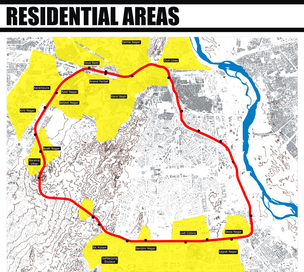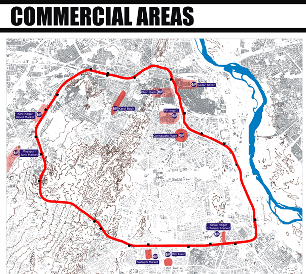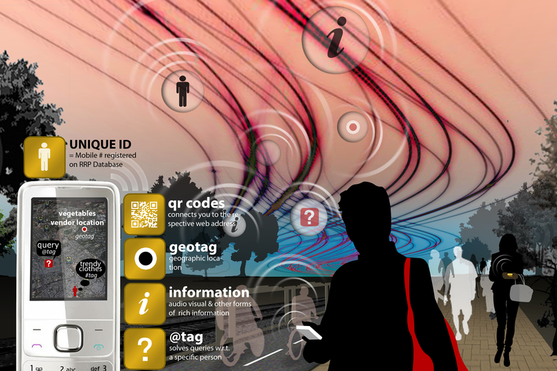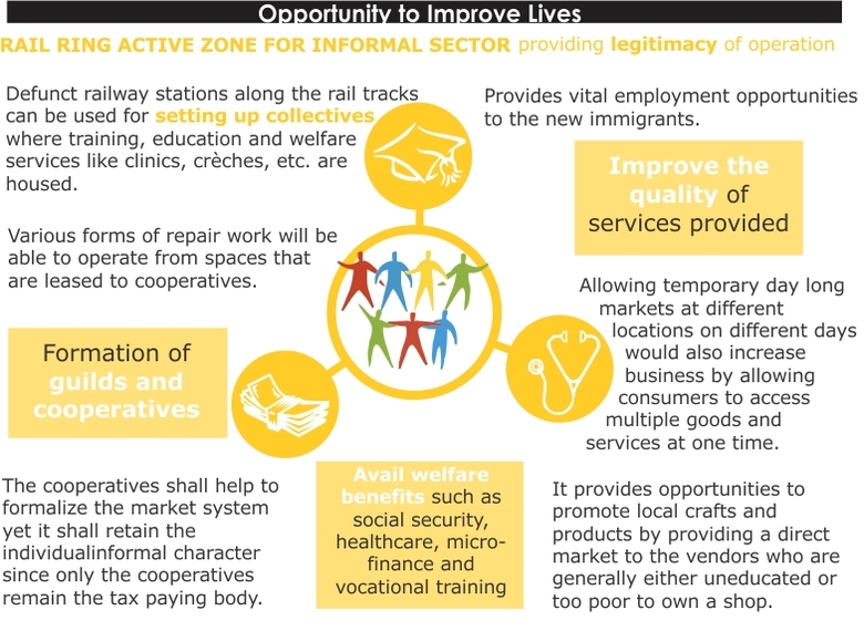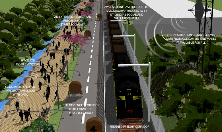 The project has been envisaged as an urban context additional to its functional role as a segregated shunting line. This project imagines the Ring beyond the Rail. It puts forth the idea of creating a contiguous belt that is human powered, a precinct that is pedestrian, cycle friendly and abuzz with urban activities that are rapidly losing their legitimate place in an increasingly car centric city. A zone that is not only close to the city's centre but could potentially be close to its heart. The project also seeks to legitimize the informal sector, recognizing its valuable contribution to the city economy and culture It encourages creation of cooperatives in the unorganized sector, which ensures them access to social and welfare infrastructure like health, education and micro finance. These cooperatives ensure them access to social and welfare infrastructure facilities like health, education, etc. Further the rail corridor proves to be an excellent site for establishing an information cloud accessed through basic and most ubiquitous mobile technology (1G) which has witnessed a deep penetration into the city population (across income groups). The cloud empowers peer to peer recommendation, the age old system that drives the informal sector, with cheap new age technology wherein which people can rate, tag and exchange information. The benefits are reaped by all stakeholders by activation of an urban space through slow transit and street economic activities. The project enhances the engagement of the people with the physical environs of the city. The technological model hence developed and the reclamation of the urban space has universal application.