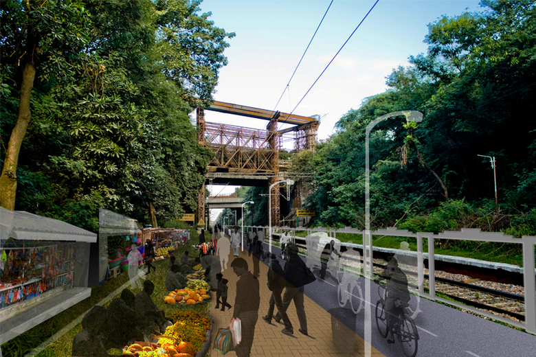 The underutilized, fossil fuel dependent mode of public transport is replaced by a non motorized mode of transit while making the best use of the infrastructure available on the corridor. Structures like platforms, stations, etc house new functional and utility requirements through adaptive reuse. The corridor passes through the heart of large swathes of urban forest. The scale of intervention and the provision of non-motorized transit require minimal resources or intrusion to the local ecology.