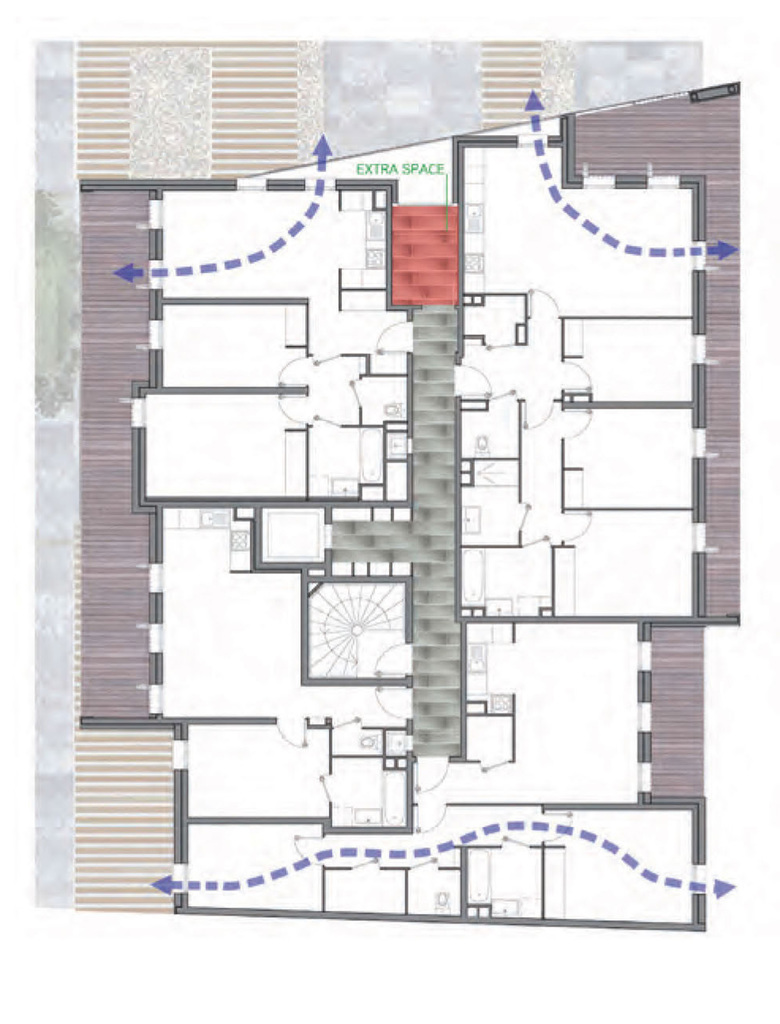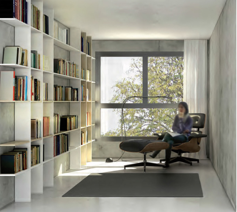 The current deep economic and social transformation is based on the new tools of the digital age and the need for new types of housing. The “extra spaces” at the ends of the corridors on each floor are innovative living areas that provide support for family reconfigurations over time. They are meant to address the needs of blended, single-parent or teleworking families or families with needs for occasional care for family members. The spaces created for these purposes are 8 m2 but large enough to be used for a variety of personal situations.