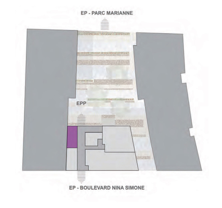 At the metropolitan scale, the morphology of this building corresponds to a reinterpretation of the required volumes for the ZAC. We propose an operating principle of stacked boxes that change the overall scale of the building, giving it a new urban structure. The permeability of the ground floor between public space (PS) and shared private space (SPS) inside the block visually connects the outside street with the interior garden and establishes a dialogue on an urban scale.