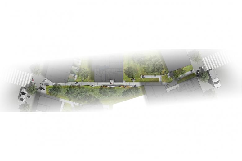 This axis supports the semi-underground and surface-level car-park, thus creating an operational landscape that interlocks with local topography and the “La Minoterie” plot on the west.