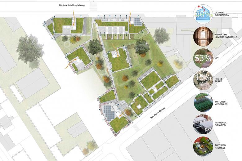 The analysis of existing elements leads us to project a system for increasing the density of block courtyards, while the project volumes of the Bradenbourg boulevard and the Pierre Rigaud street extend the reverberations of existing buildings.