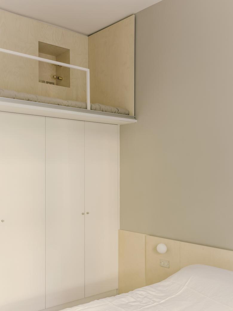 The master bedroom includes a third bed, cleverly integrated above the wardrobe, making the most of the apartment’s height without cluttering the room.