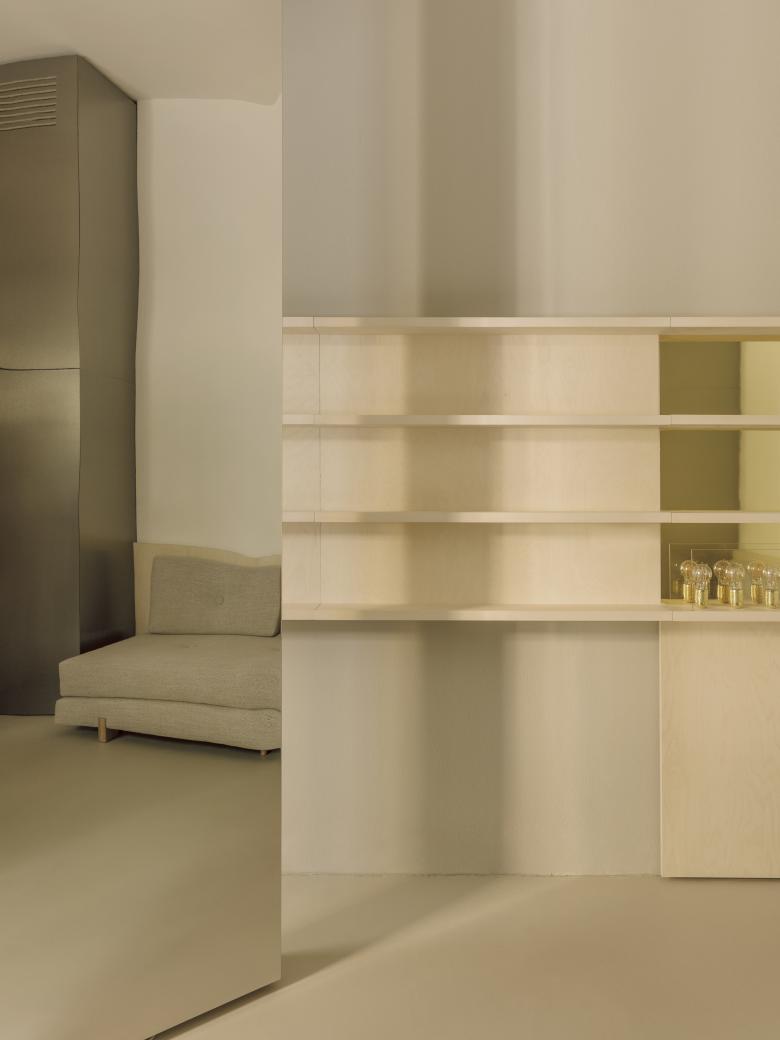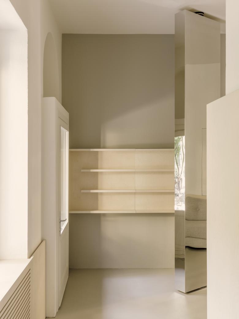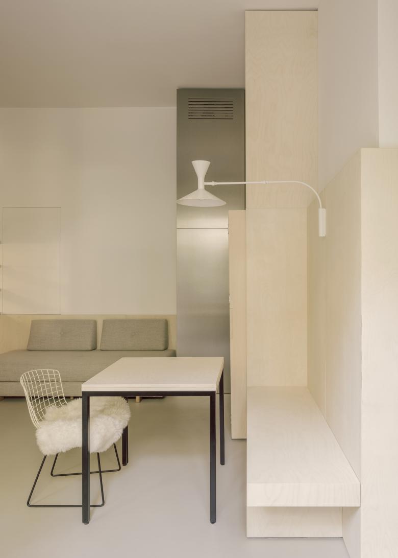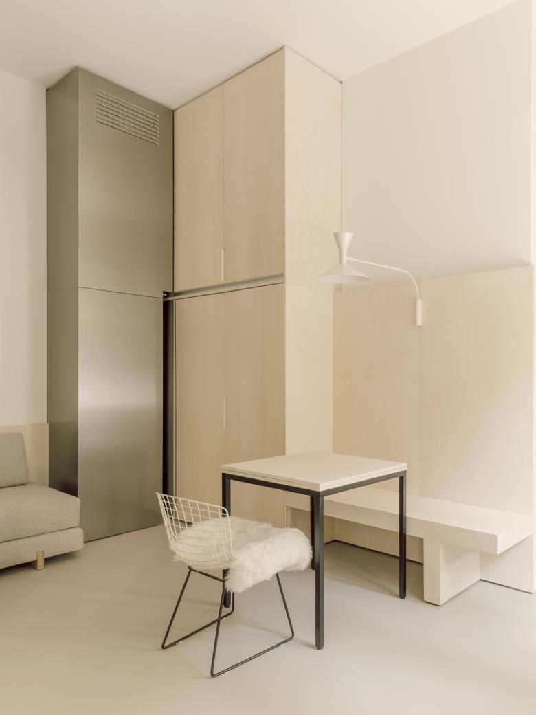 Every piece of furniture has been custom-designed, shaping the small spaces with precision and meticulous attention to detail.
