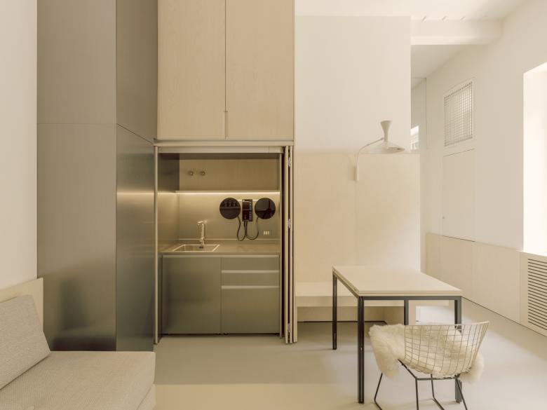 The living area, cozy and versatile, features a sofa bed, while a fully concealed kitchen allows the space to be transformed, hiding any trace of its technical function when used as a sleeping area.