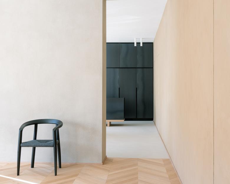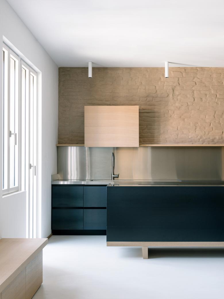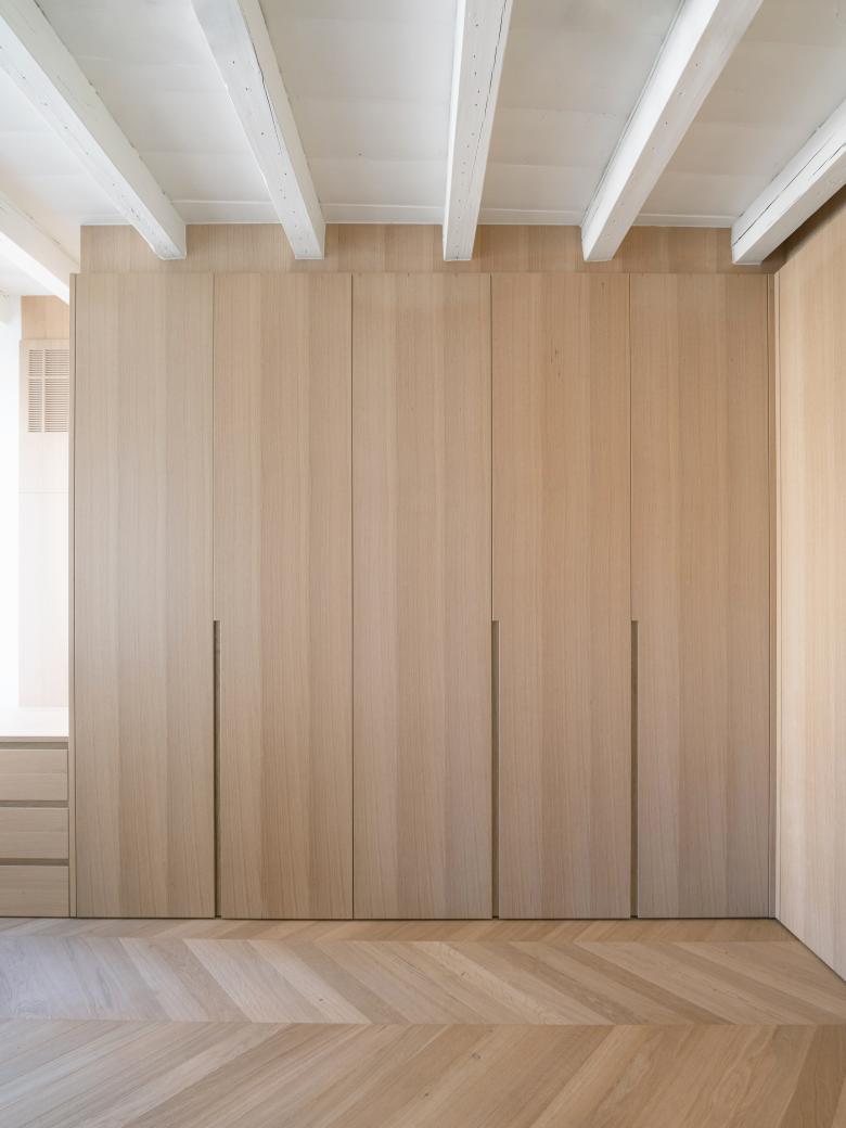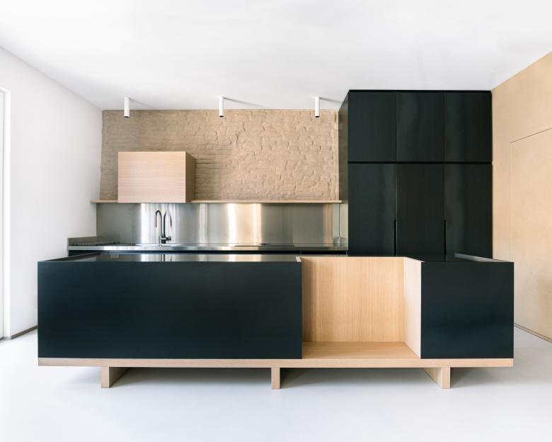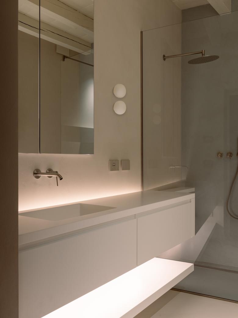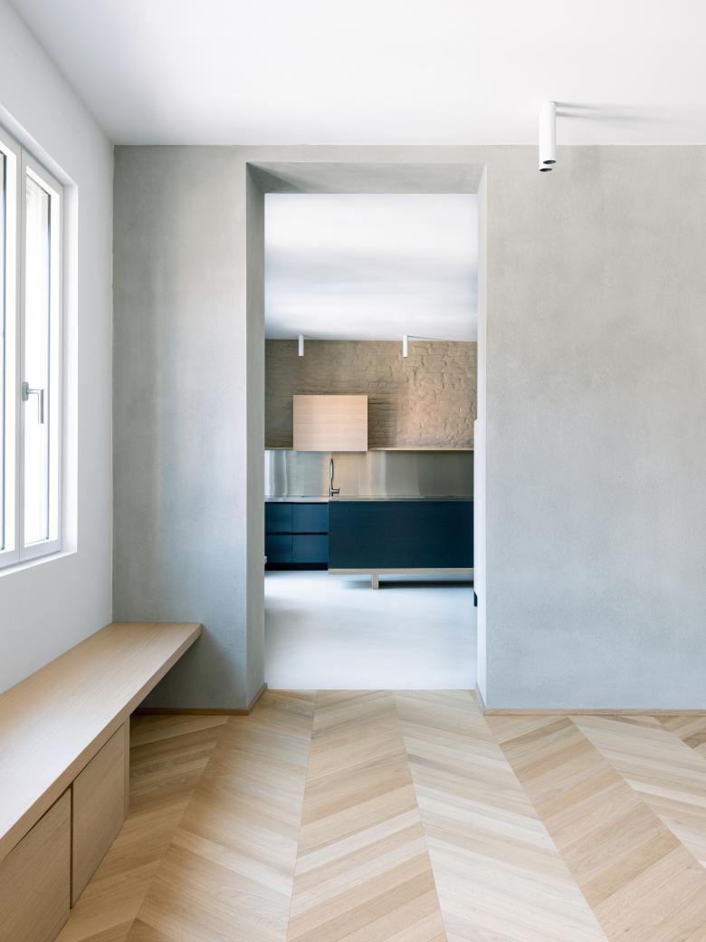 In quest'ultimo dei tagli verticali ai margini delle pareti perimetrali definiscono dei coni visivi che stratificano la percezione degli ambienti domestici aperti del soggiorno e della cucina, ampliandone così la percezione.